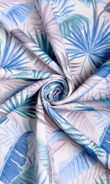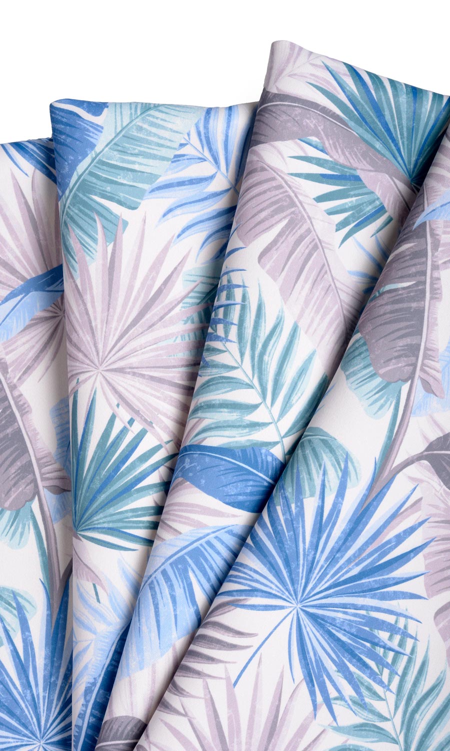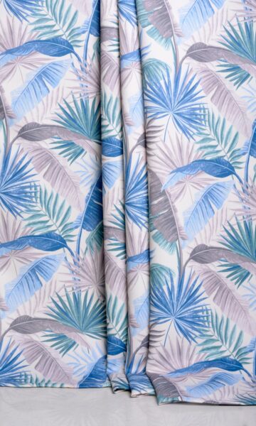 Leaf prints in vibrant hues – a modern expression of a nature-inspired theme. Blues, greens and grays dominate the large graphics of tropical leaves on a white backdrop making a great window dressing for a color-saturated space. If you love to decorate your home with indoor plants but lack a green thumb, ?Feather Blue? can be a solace with its outdoorsy vibe.