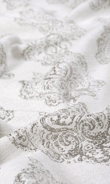 If you like traditional jacquard motifs but dislike intense color palettes and overly ornate design elements, Fixar should appeal to you. This sturdy polycot drapery fabric has an off-white base patterned with a traditional, oversized and stylized botanical motif in gray. The texturally rich base and the raised pattern look good together; as does the simple no-fuss color combination.