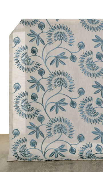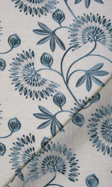 If fields of flowers are your idea of paradise, here’s a heavenly choice for you. Folha is an exquisite semi-sheer pale beige fabric embroidered with an exotic floral vine pattern in teal blue. Reminiscent of a work of art, this fabric is perfect for creating draperies for a mellow, peaceful place that’s your haven on the earth.