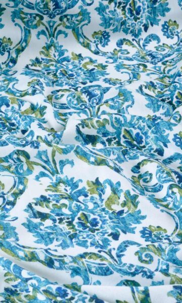 For elegant window treatments that must also make a strong visual impact, this immaculate piece of luxe beauty is on offer. Bearing the traditional and much-revered damask motif in olive green and various shades of blue on a white backdrop, this fabric is best described as an enchanting beauty. Drapes and roman shades in this bold patterned fabric are ideal for traditionally-styled large rooms and open-plan houses.