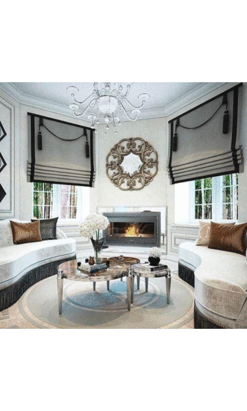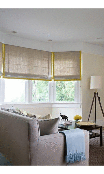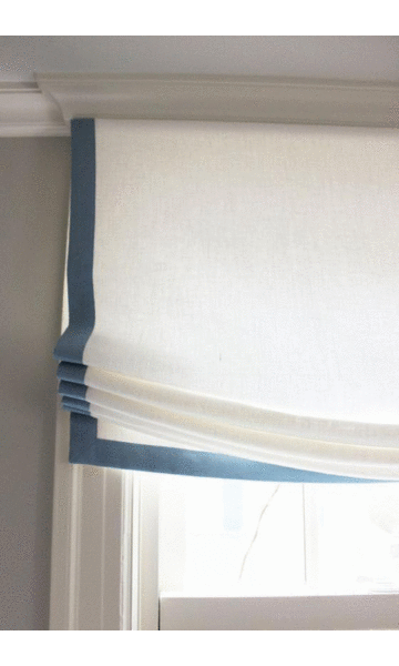 For a ‘Border’ position, the 38 mm wide ribbon trim is handstitched at edge on three sides (bottom, and left and right hems of roman shades) for a delightful effect.