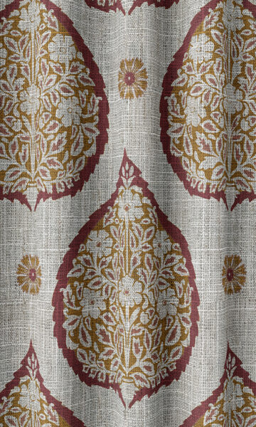 If you love the delightful medley of old and new, this fabric featuring the ancient Moghul motif in a sophisticated red and orange is a must-buy. Grand cordate leaves engraved artfully with the narcissus shrub and juxtaposed with tiny flowers make for an arresting paisley-inspired window dressing. The scaling and the delicate intricacy doubly ensure that you?re signing in for a statement piece. And what better way to show off your love for oriental vintage art!
