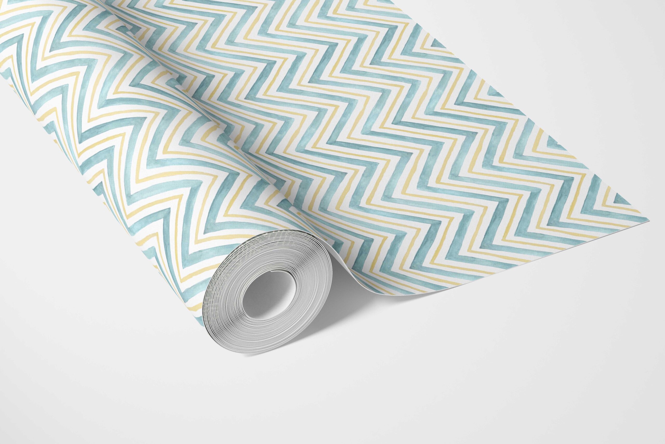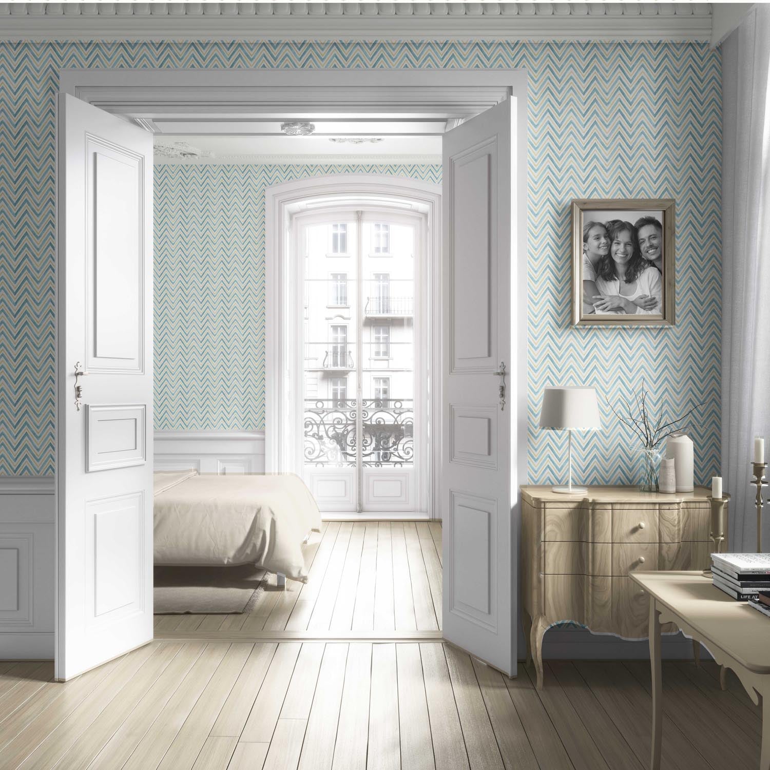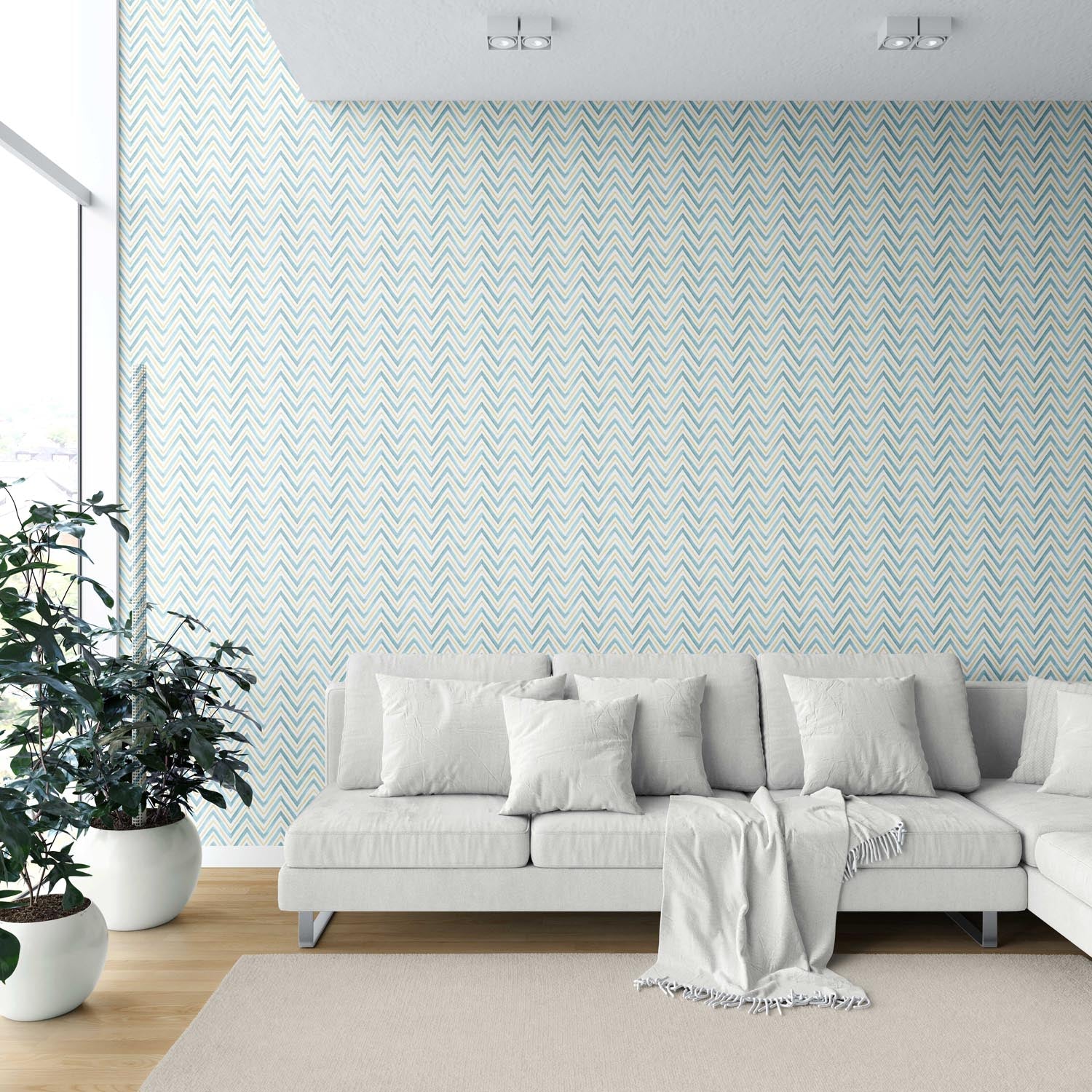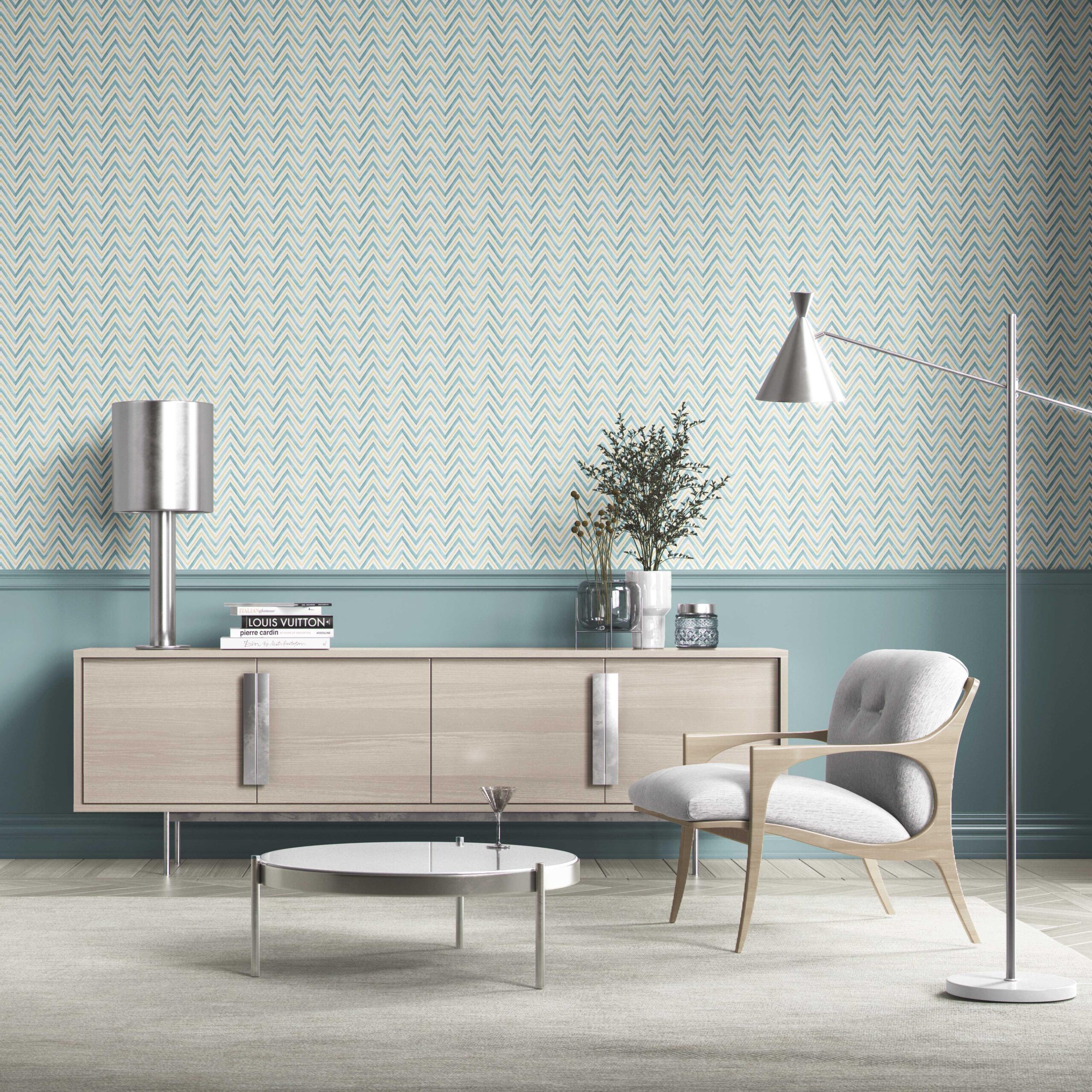 ‘Gazania’ Geometric Zigzag/ Chevron Wallpaper (Blue/ Yellow)