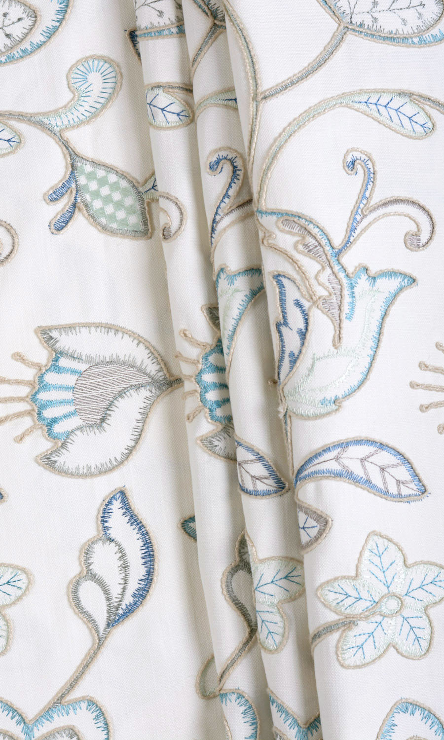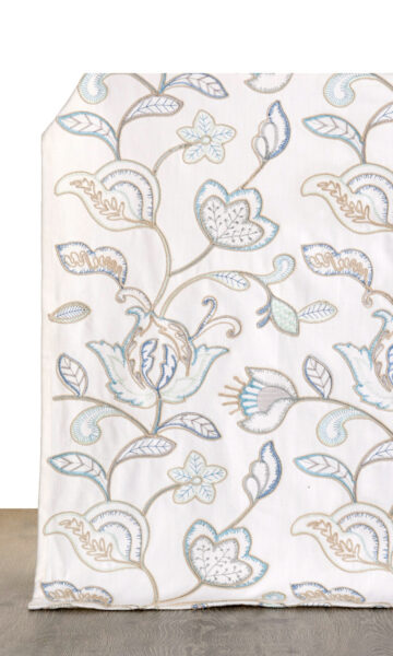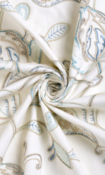 A dream in a drape. Its vast white expanse is embroidered with an all over pattern of flowers, buds, leaves, vines, and tendrils, all in hazelwood beige and indigo blue. Soothing to eyes, gorgeous to look at, and elegant in any space, that’s Gedrukt for you.