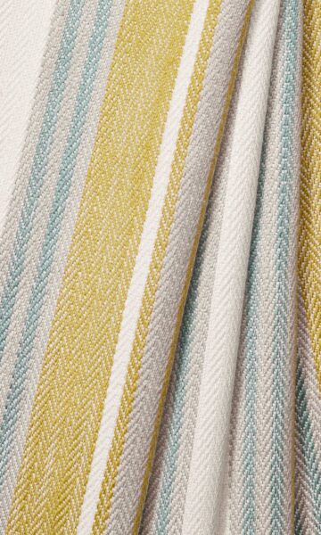 Statement stripes do not get prettier than they look in this fetching woven fabric. It is covered in simple but really eye-catching vertical stripes of varying width and colors – gray, white, blue and mustard yellow. The fine herringbone weave provides perfect fall and drape. You can use this fabric for both curtains and roman shades.
