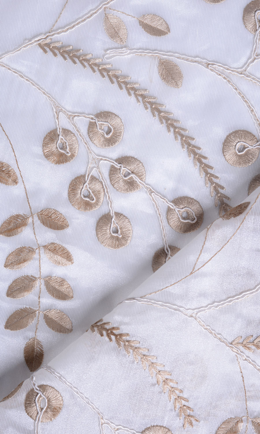 When your windows need a hint of understated glamour, look no further than these custom size sheer drapes. Their sheer white base has been embroidered edge to edge with a sweeping pattern of berries, leaves and twigs in shimmery golden beige highlighted with raised white threadwork. The sturdy blended fabric looks lovely on its own and can also be backed by lining for added privacy.