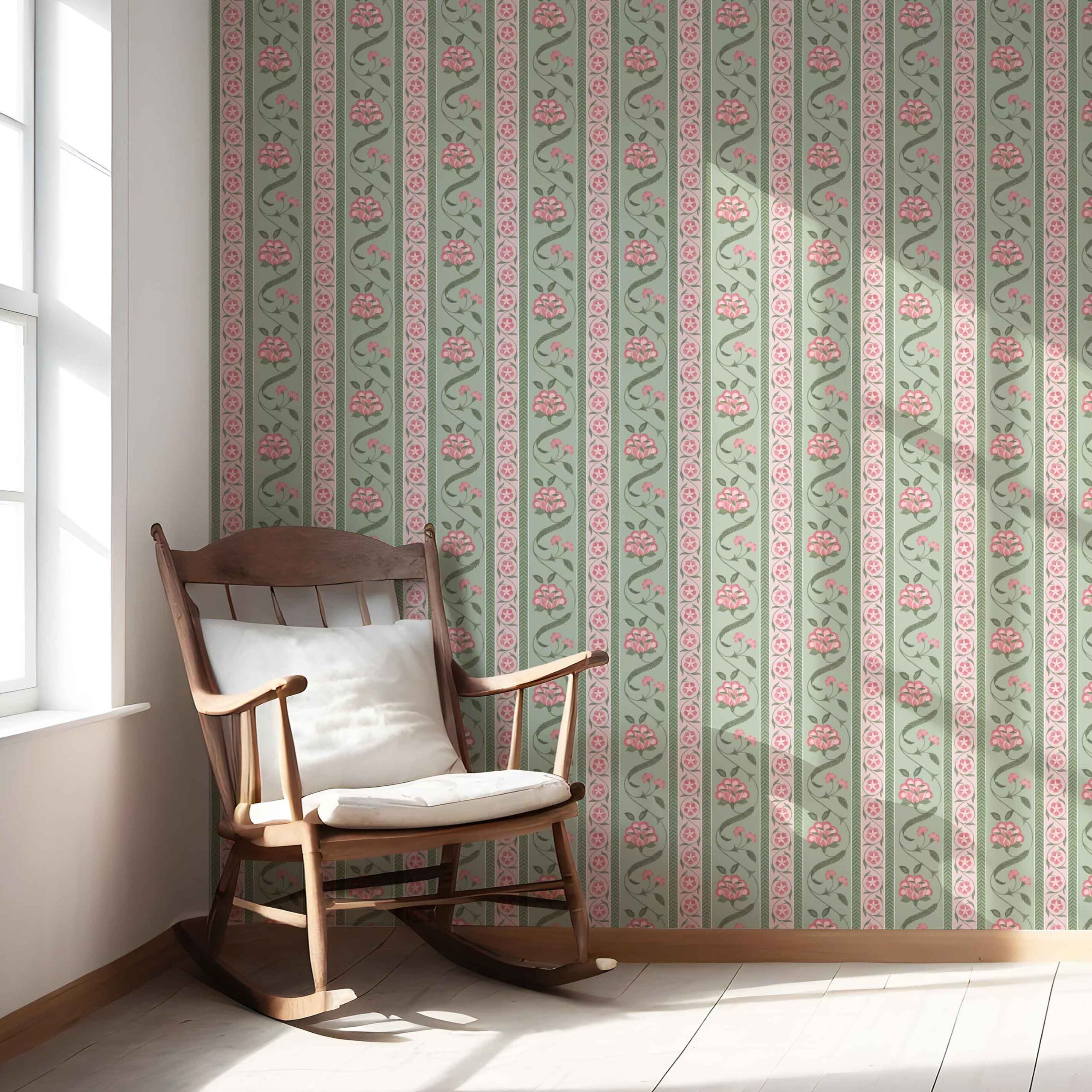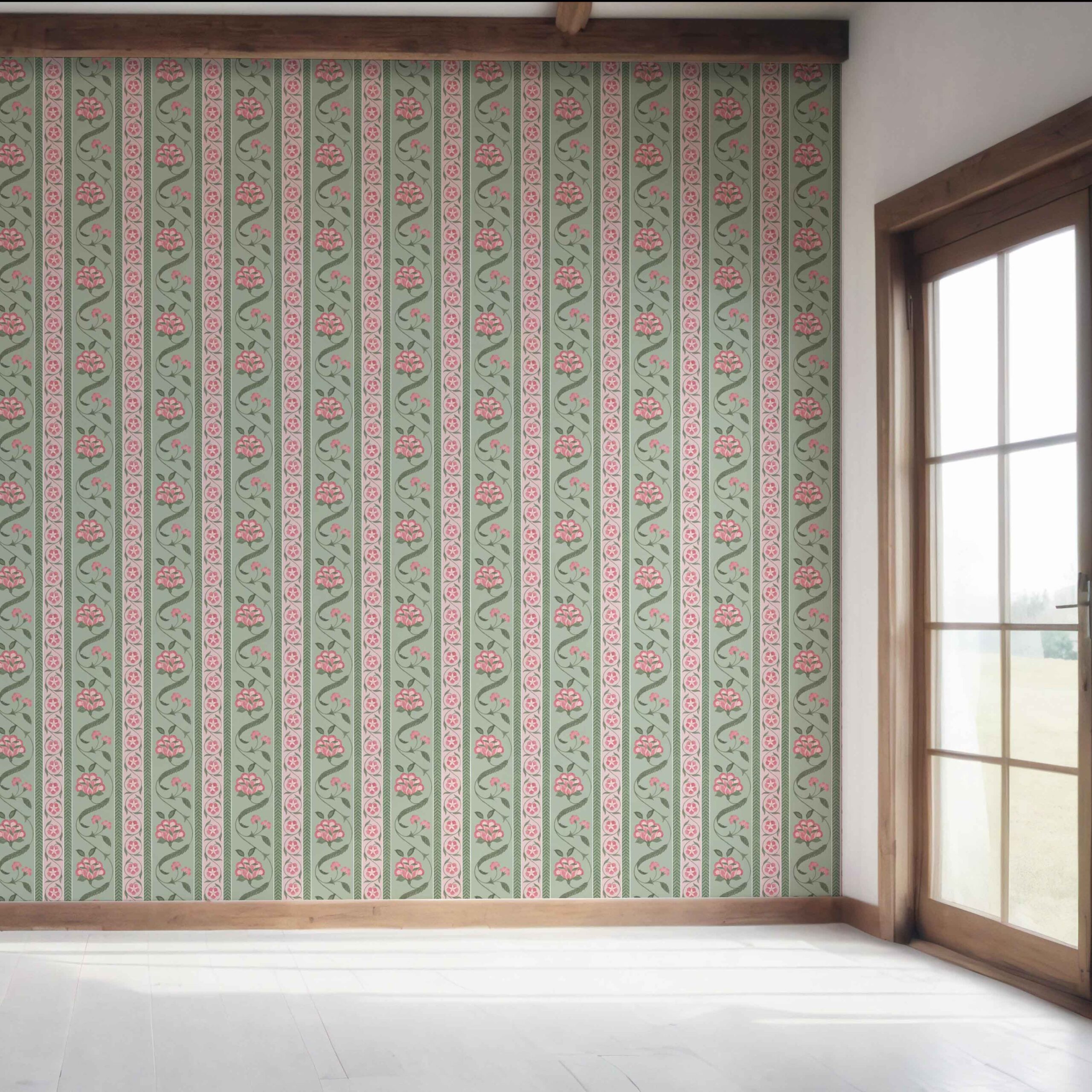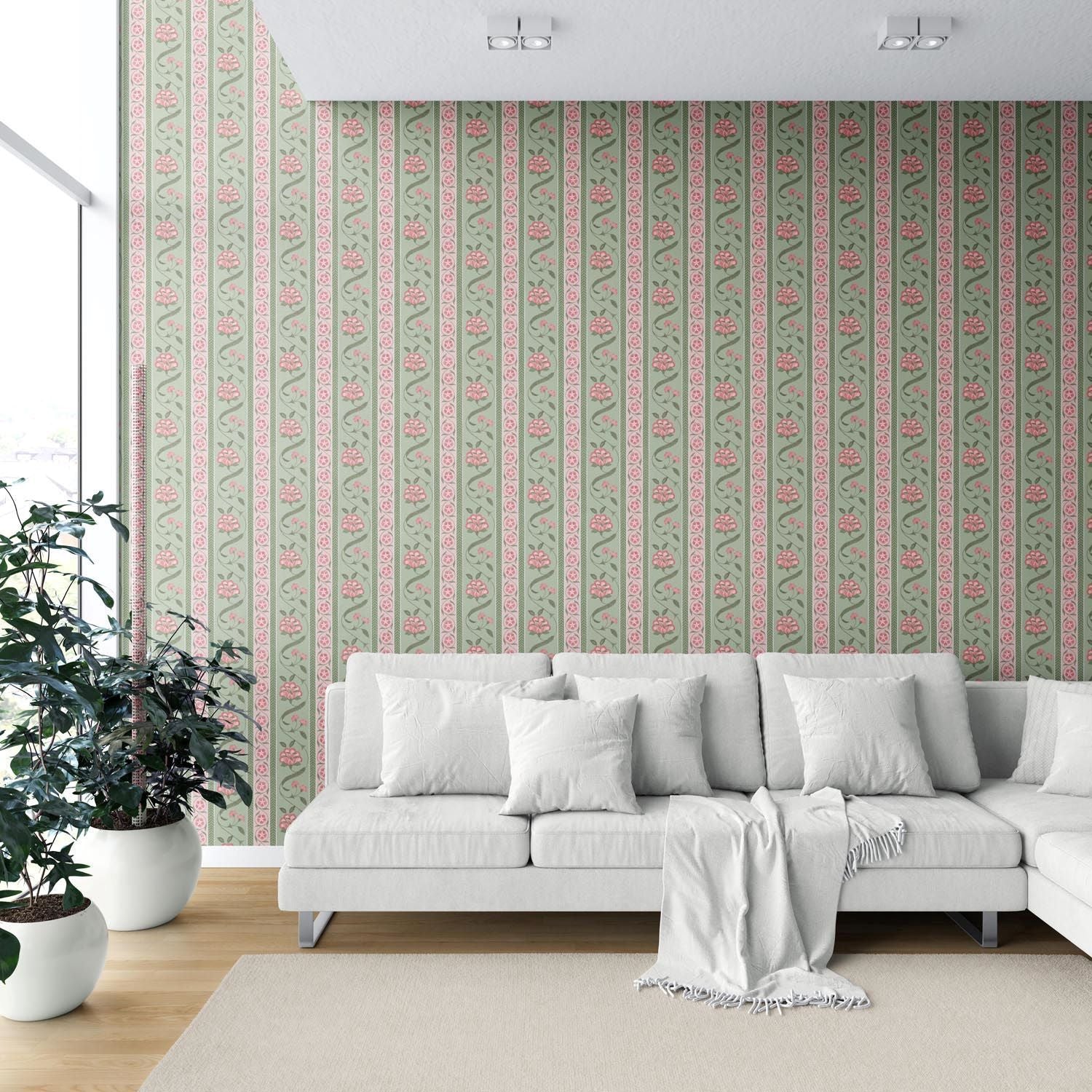 ‘Hallstatt’ Floral Botanical Striped Wallpaper (Green/ Pink)