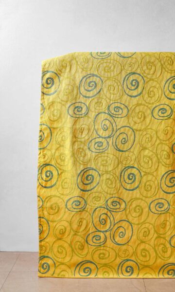 Featuring more than a hint of color and joy, this fabric brings cheer wherever it’s hung. A sunny yellow with blue swirls, it serves as an excellent accent backdrop to any blue-led decor.