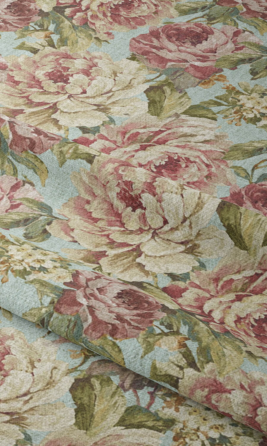 Invite the beauty of an English garden into your home with beautiful window treatments in this floral fabric. Blush roses set in a pale blue backdrop can transport the serenity of a flower-laden meadow to any interior decor that seeks to cherish the immaculate beauty of nature. In urban locales, where every window exposes the eye to a concrete jungle, this floral beauty offers a glad break. The grand scaling renders a modern touch to an otherwise traditional motif and enables it to blend with every style of interior design.