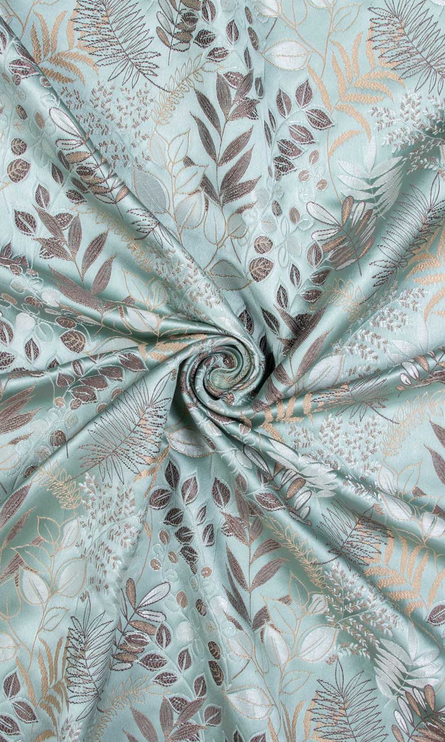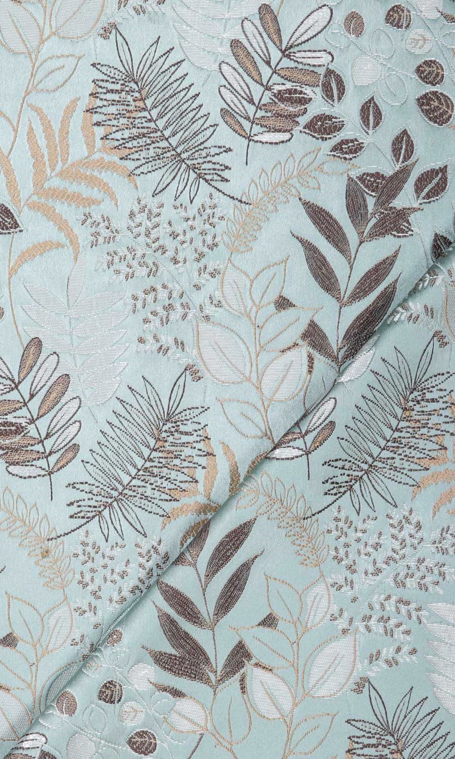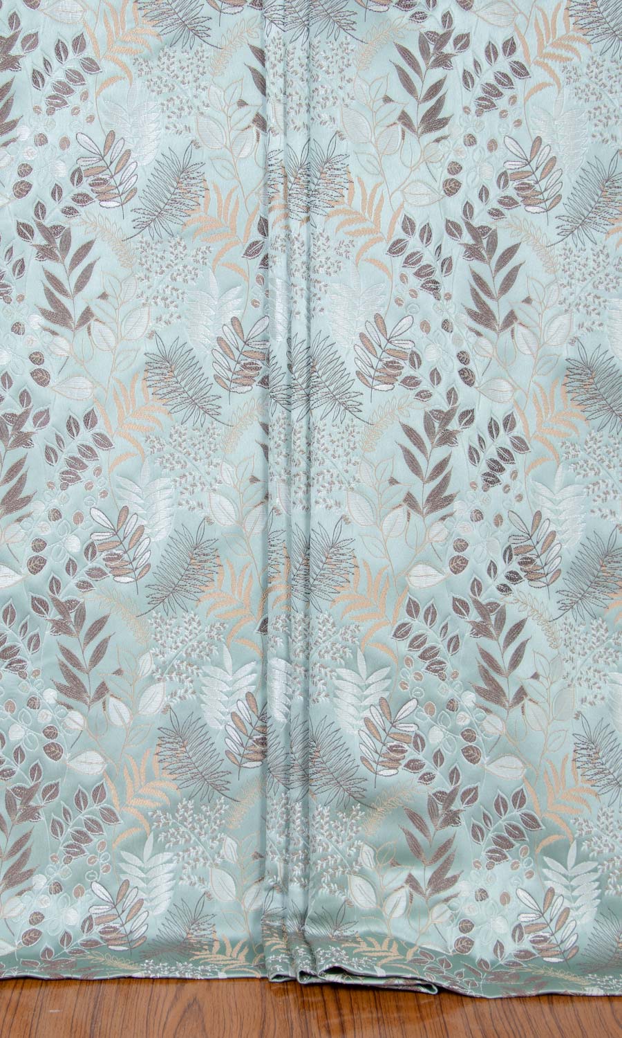 Botanical prints in quiet colors and a gentle sheen. Bring nature-inspired themes to your decor with Juniper’s intricately detailed brown leaf prints spread over a pastel blue backdrop. Its vertical layout draws the eye upward, making it a great choice for low-ceiling rooms to create the optical illusion of a taller window and higher ceiling.