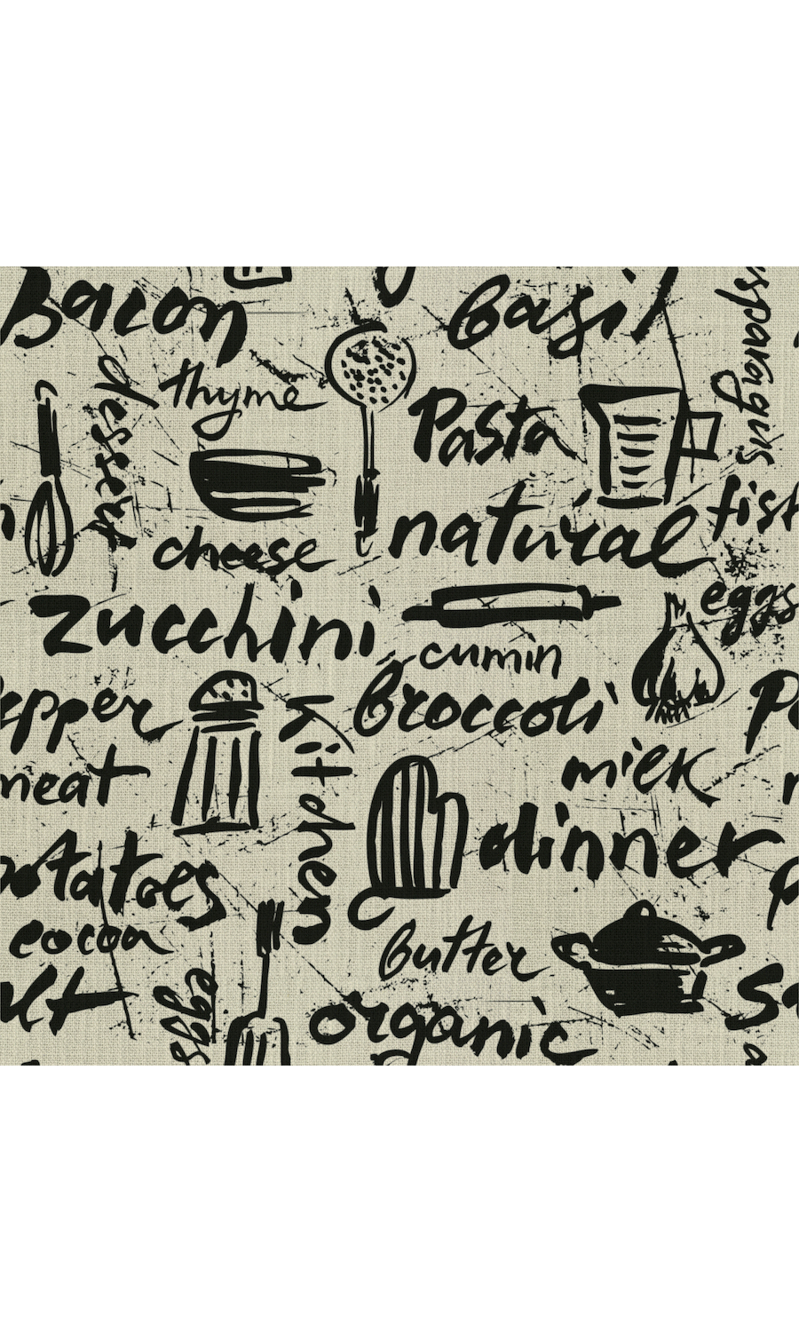 Just the fabric to add a touch of rustic chic to your cooking space. Its basic black and white color palette gets a warm, quirky edge with a combination of kitchen item graphics and food ingredient names written in free flow form. From rolling pins to salt shakers, kitchen mitts to ladles, it has them all. Kitchen love, pure and simple.