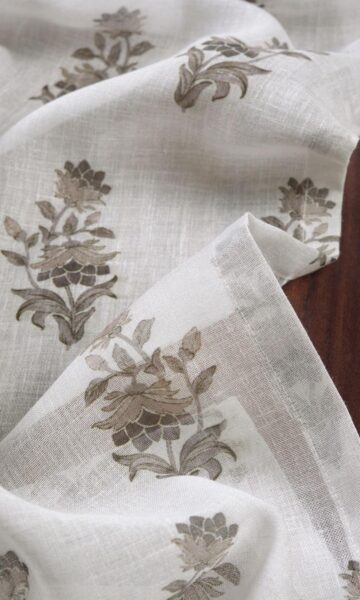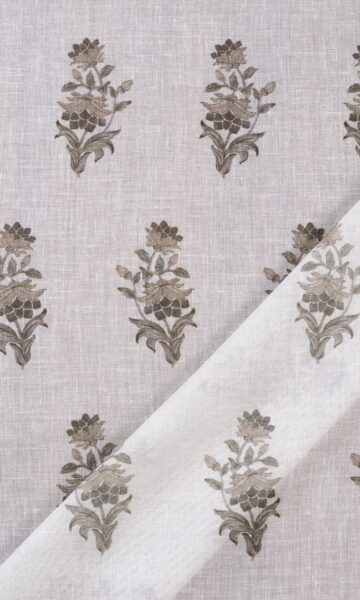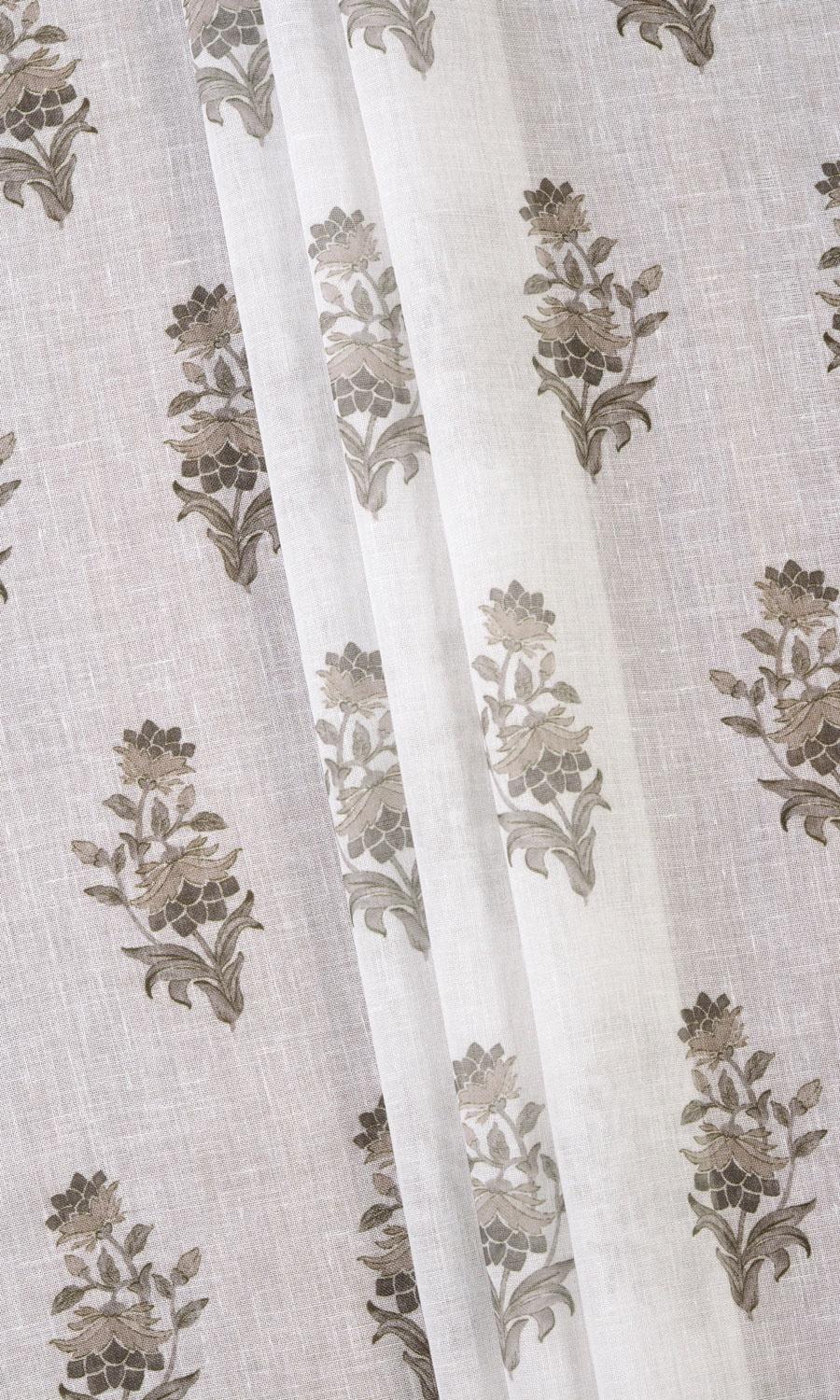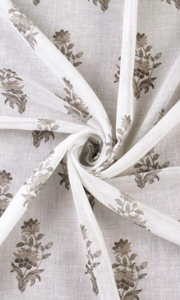 A white sheer with a floral surprise. Kashish allures not with busy patterns or deep colors but with softness and quietness. Floral branchlets in an understated palette of greige and grey sprinkled across a gossamer white bring on a dreamy elegance and nature-inspired themes. Its small-scale pattern in neutral colors make it a versatile piece capable of teaming up with most patterns and palettes.
