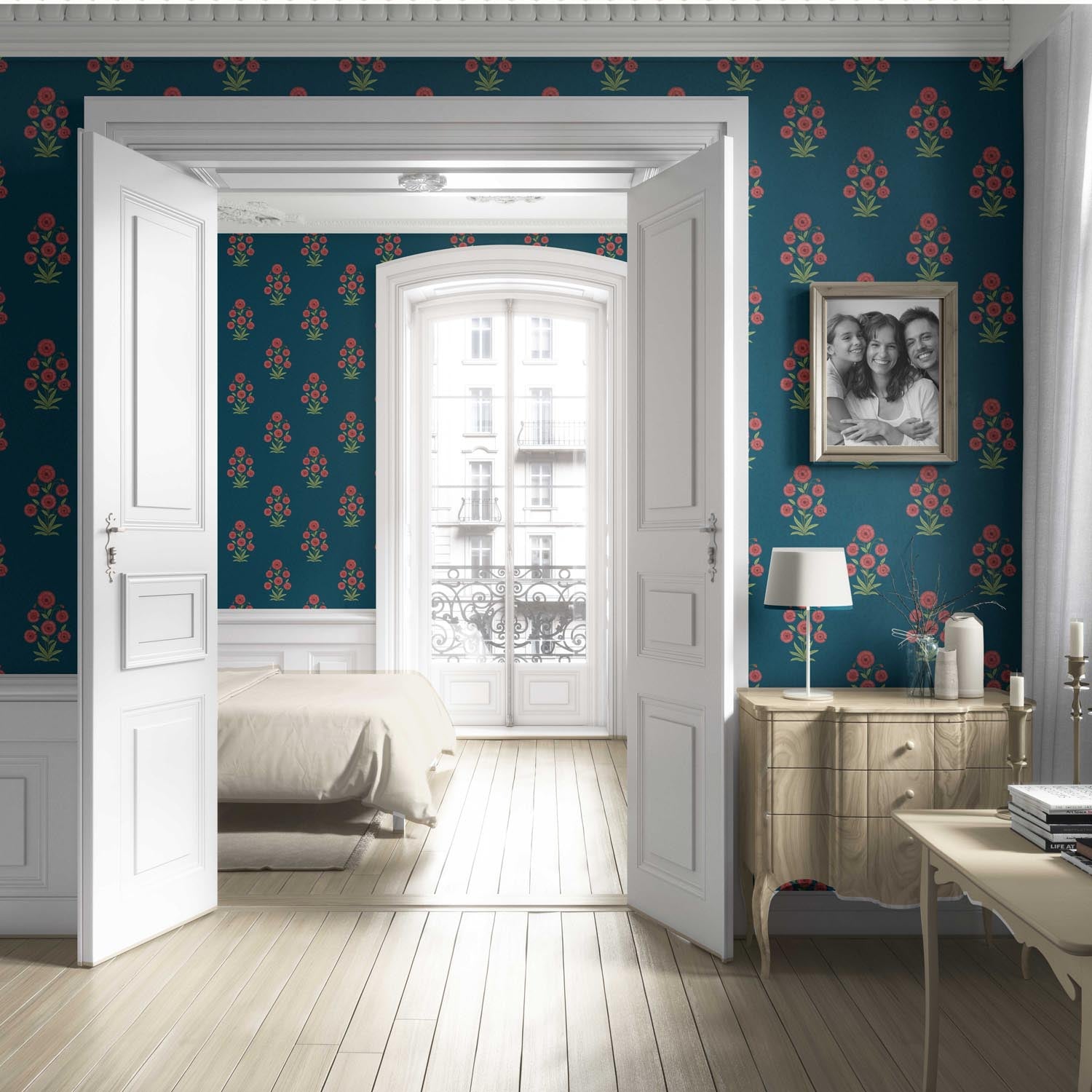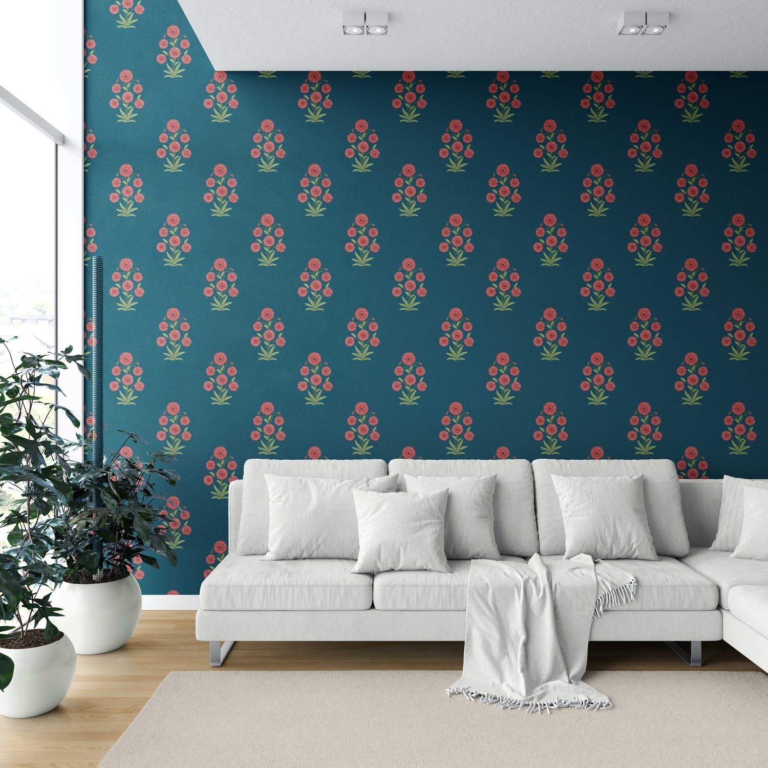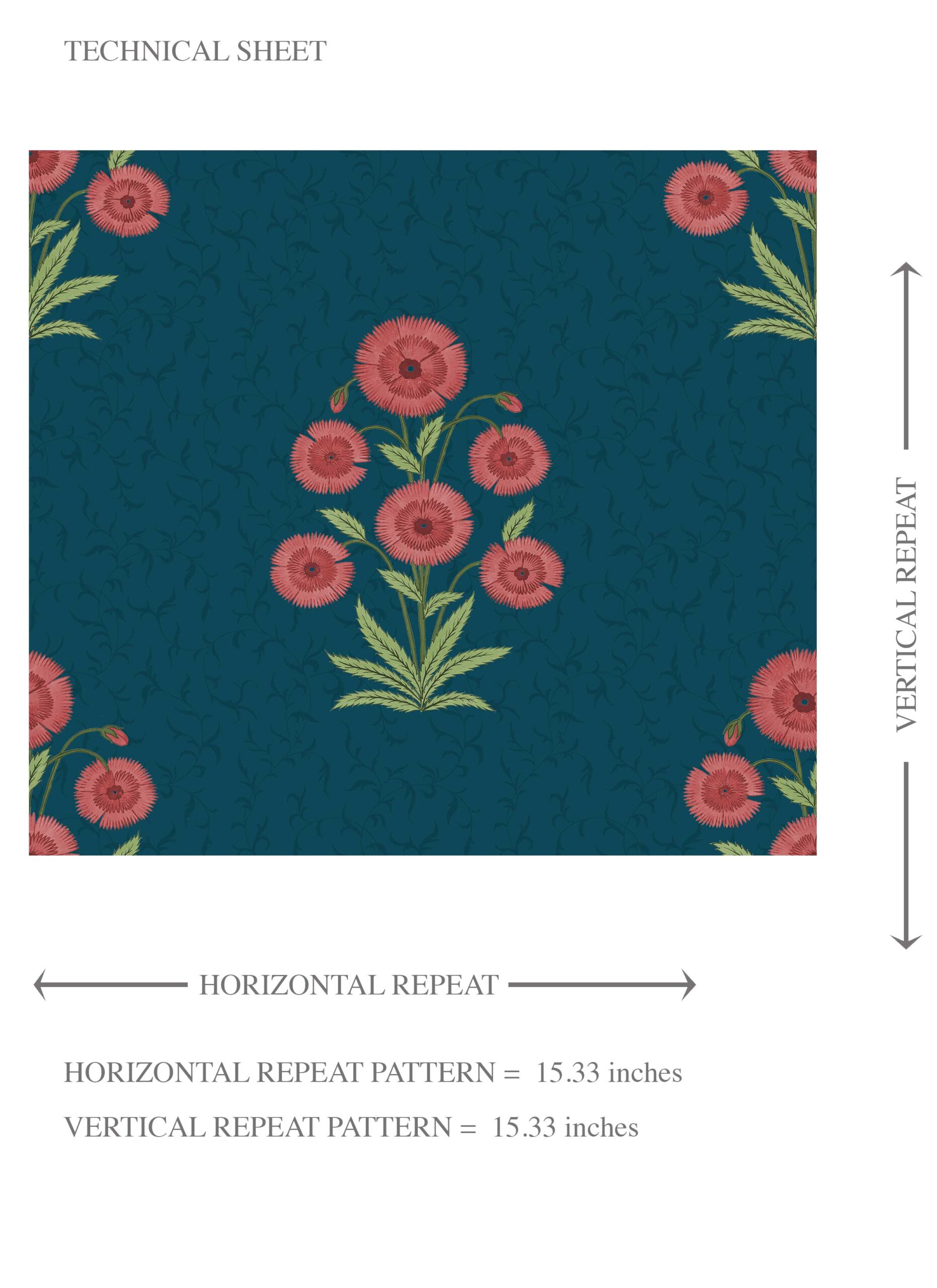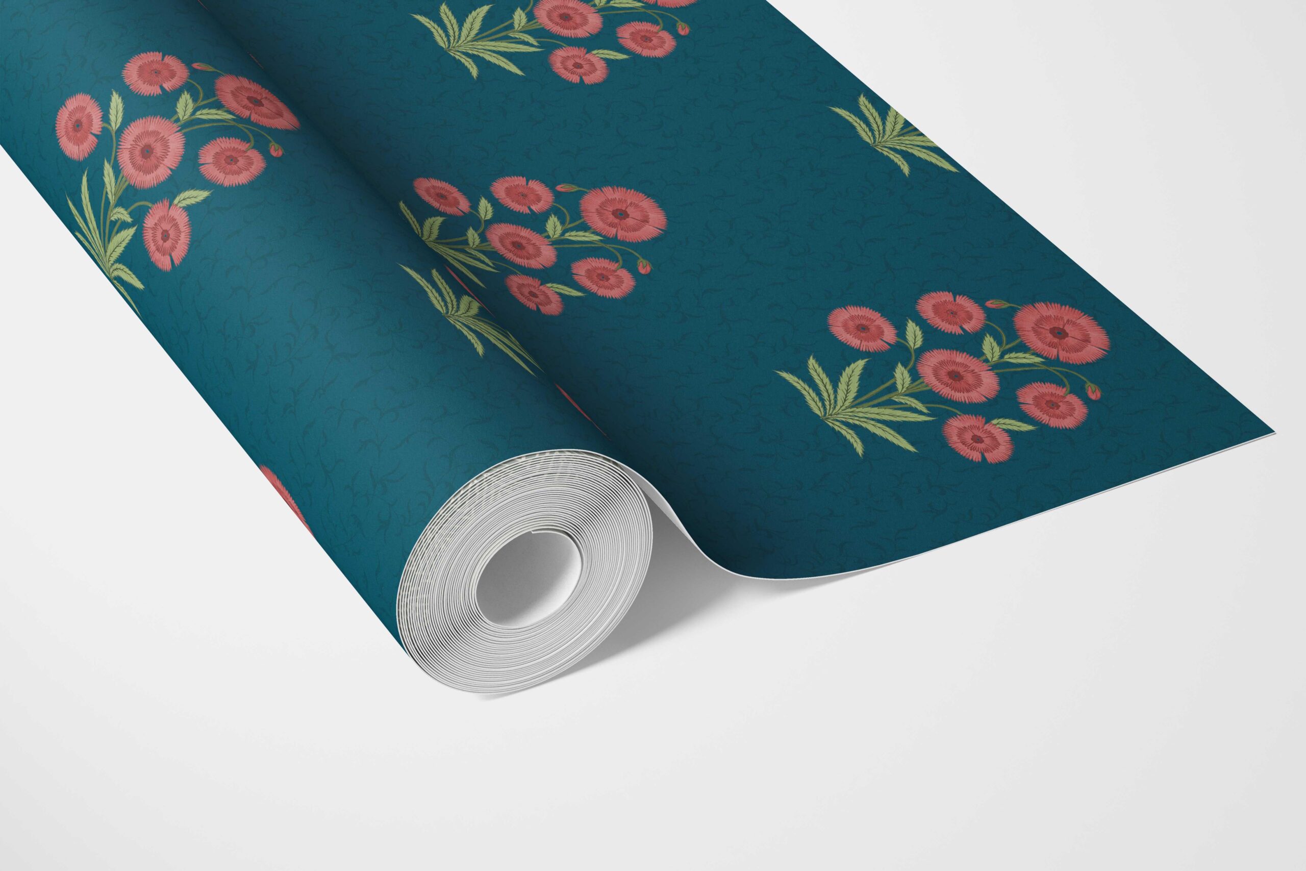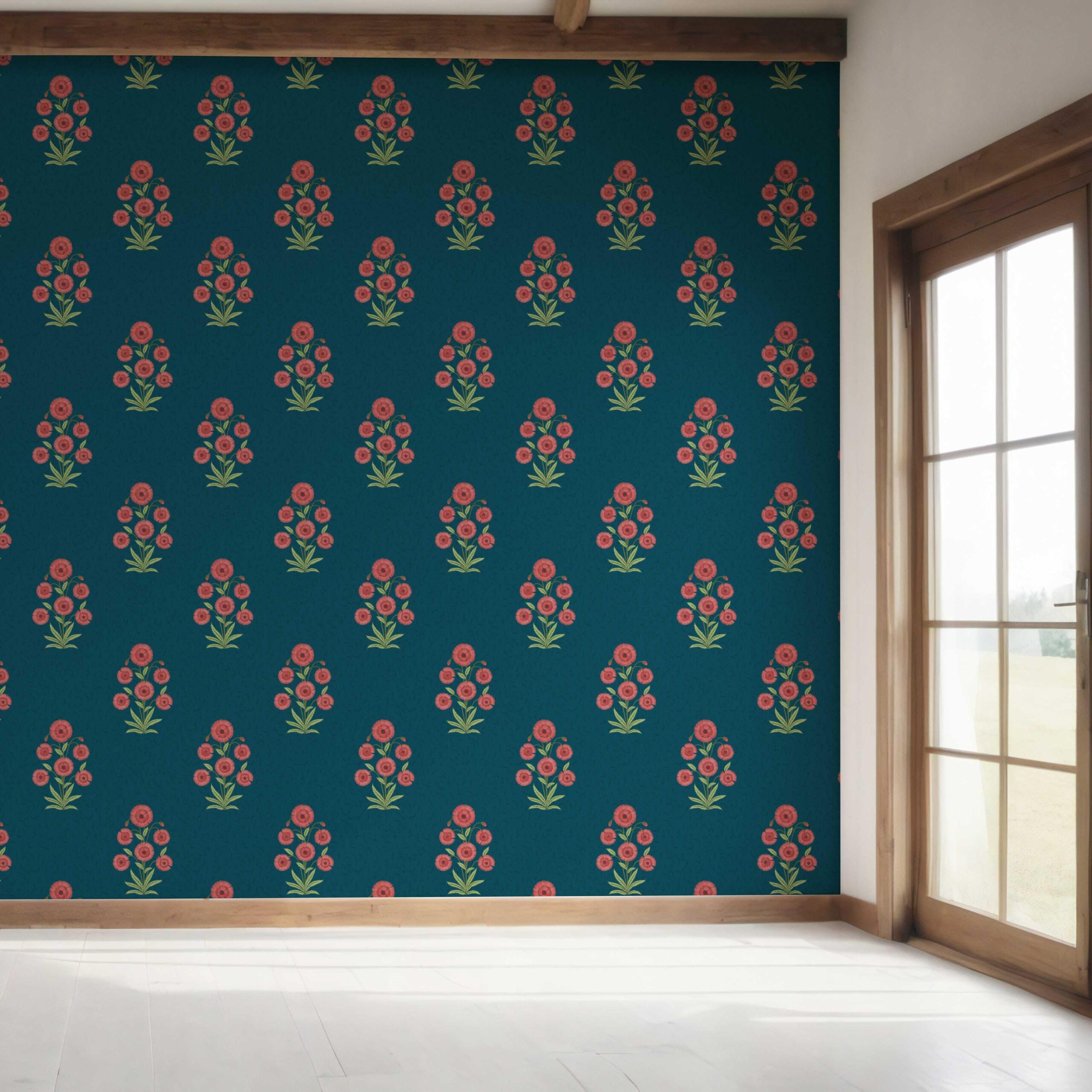 ‘Kirosi’ Botanical Floral Block Print Wallpaper (Teal Blue/ Red-Pink/ Green)