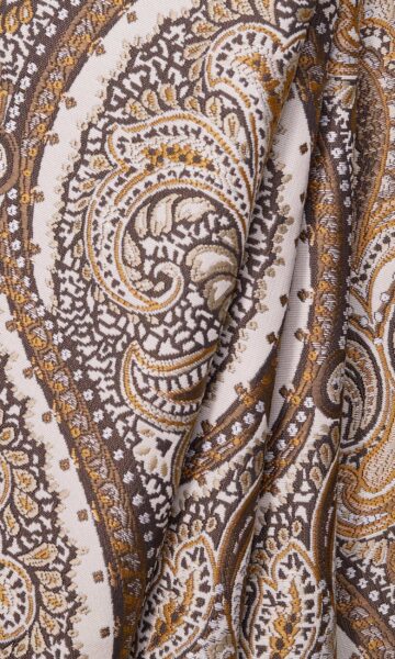 This plush jacquard woven fabric features a stunning motif reminiscent of antique Persian rugs prized by the connoisseurs. The intricate weave in glowing shades of caramel brown, ocher yellow, burnt umber and soft white looks bewitchingly beautiful. Utterly patrician!