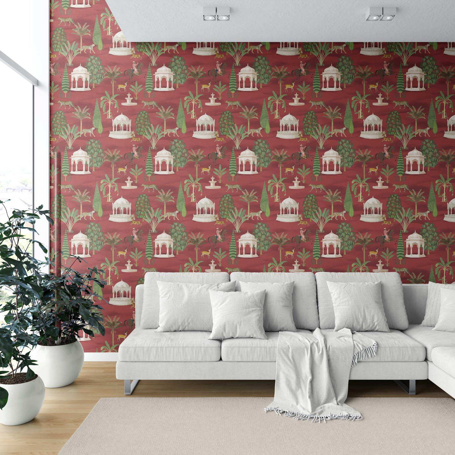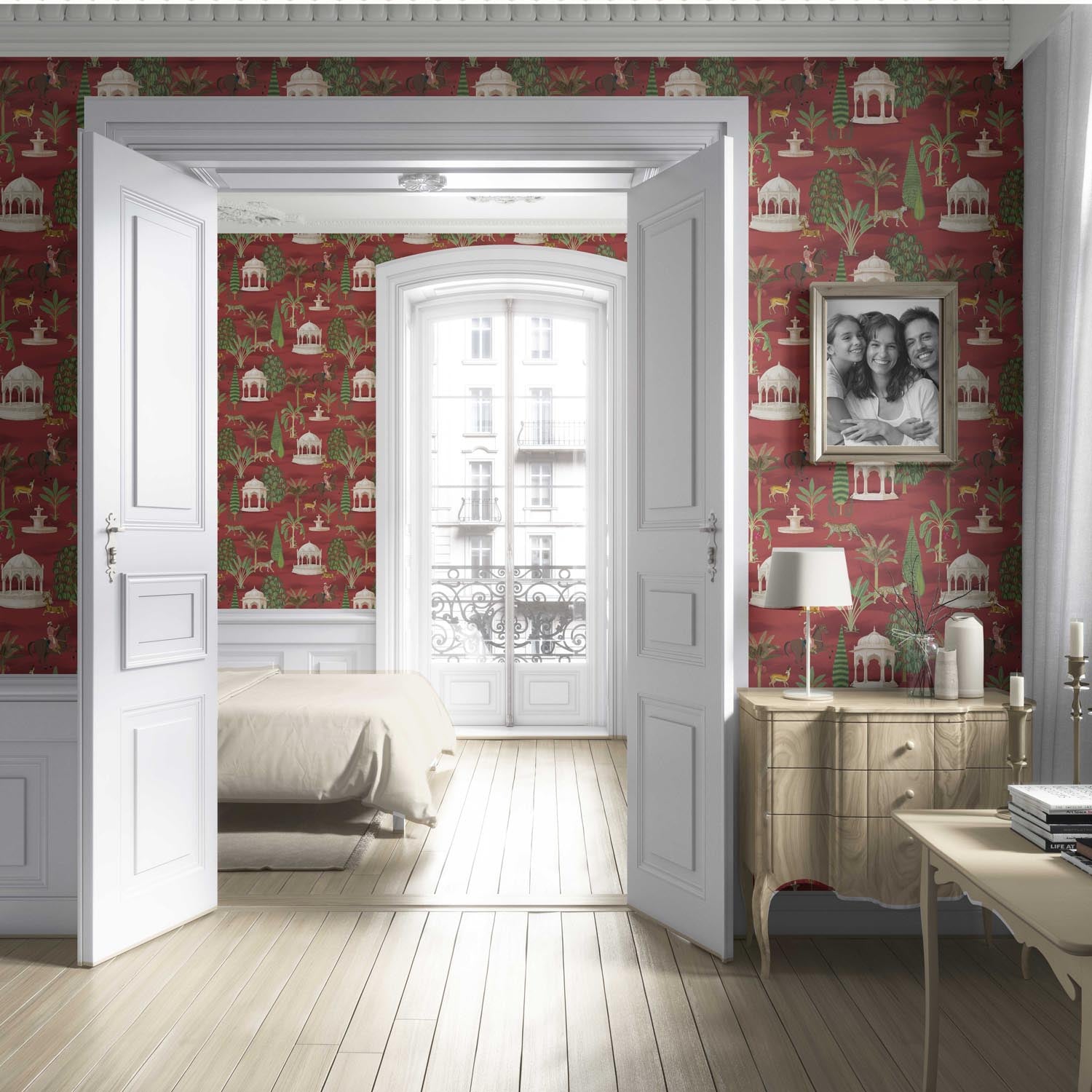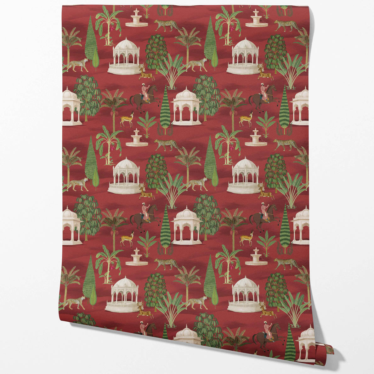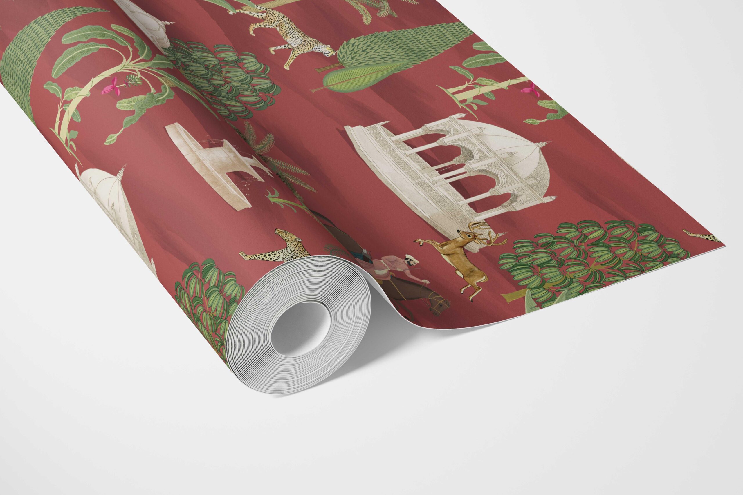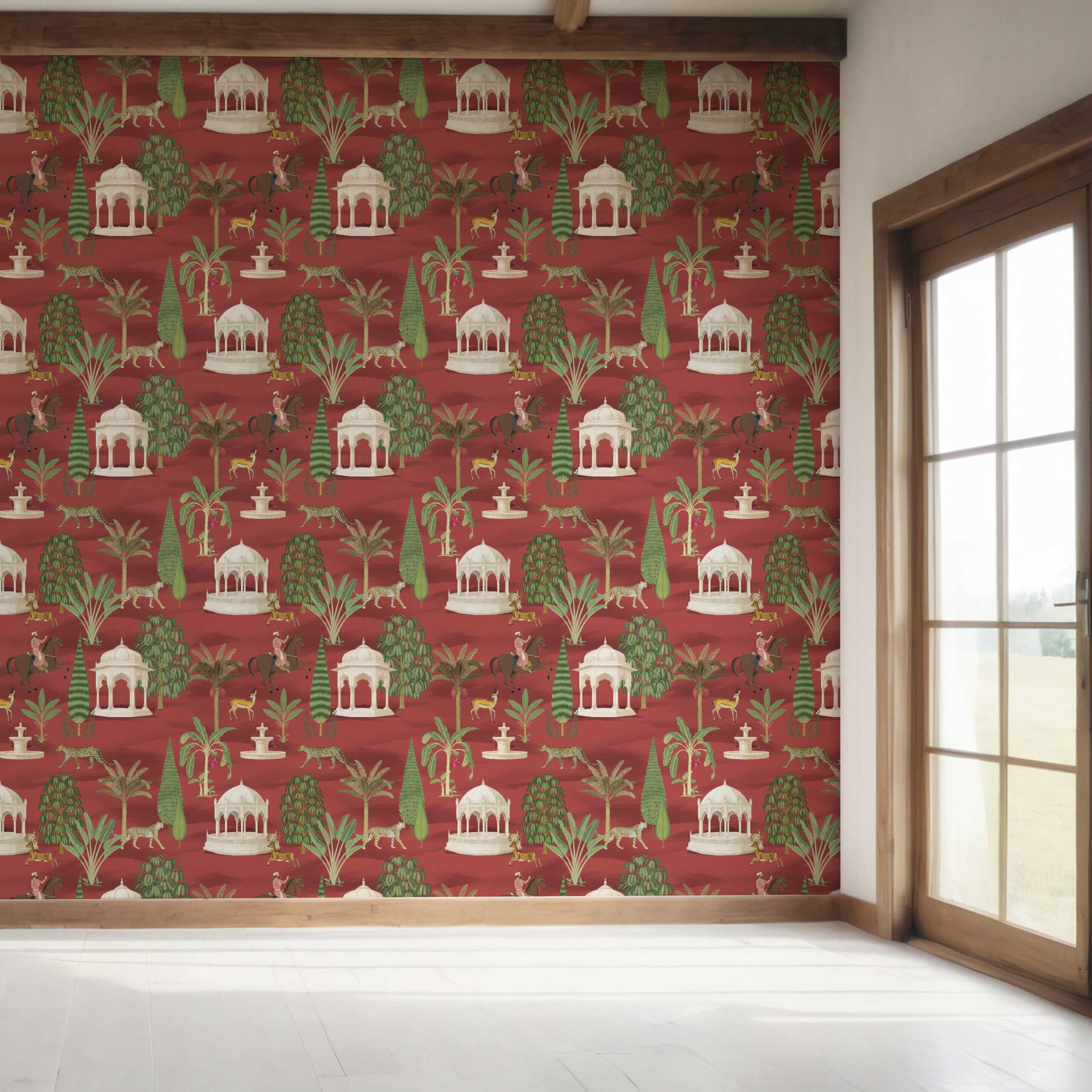 ‘Konark’ Vintage Heritage/ Ethnic Chinoiserie Wallpaper (Red/ Green/ White/ Brown)