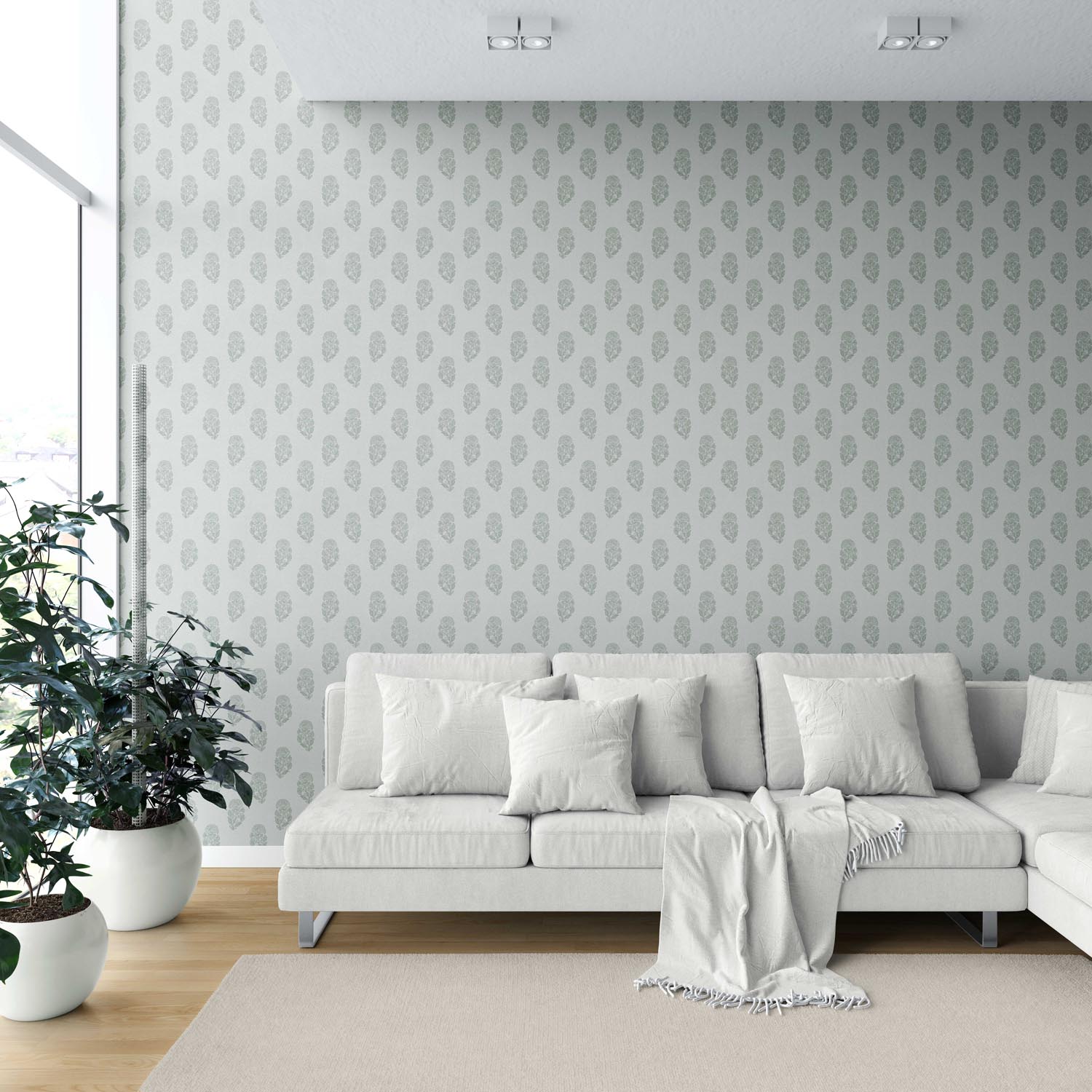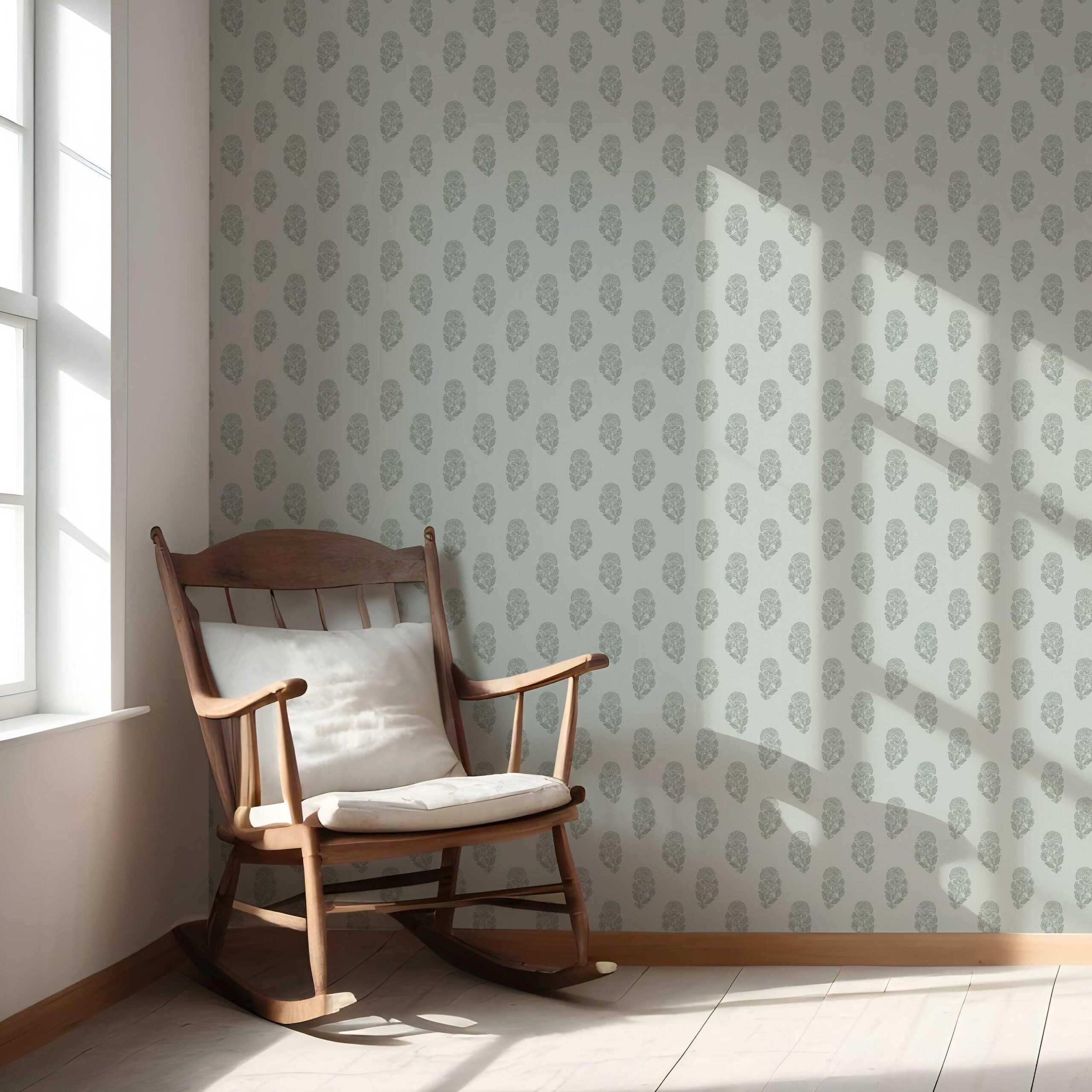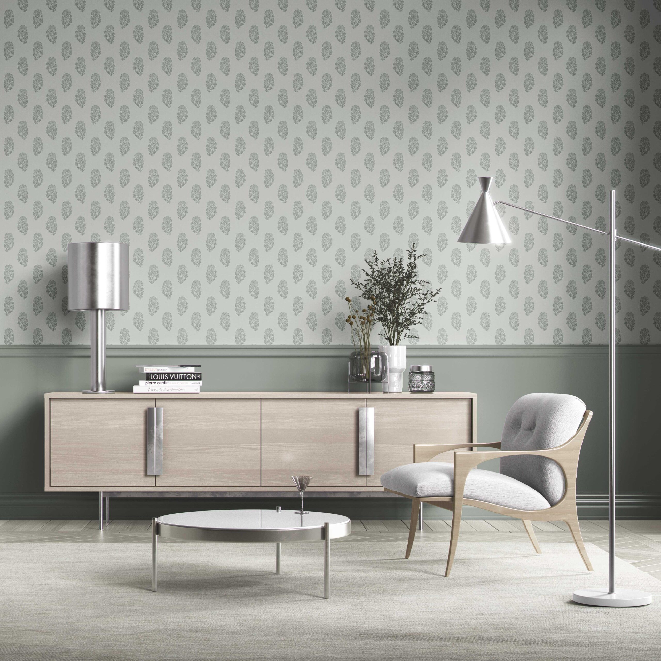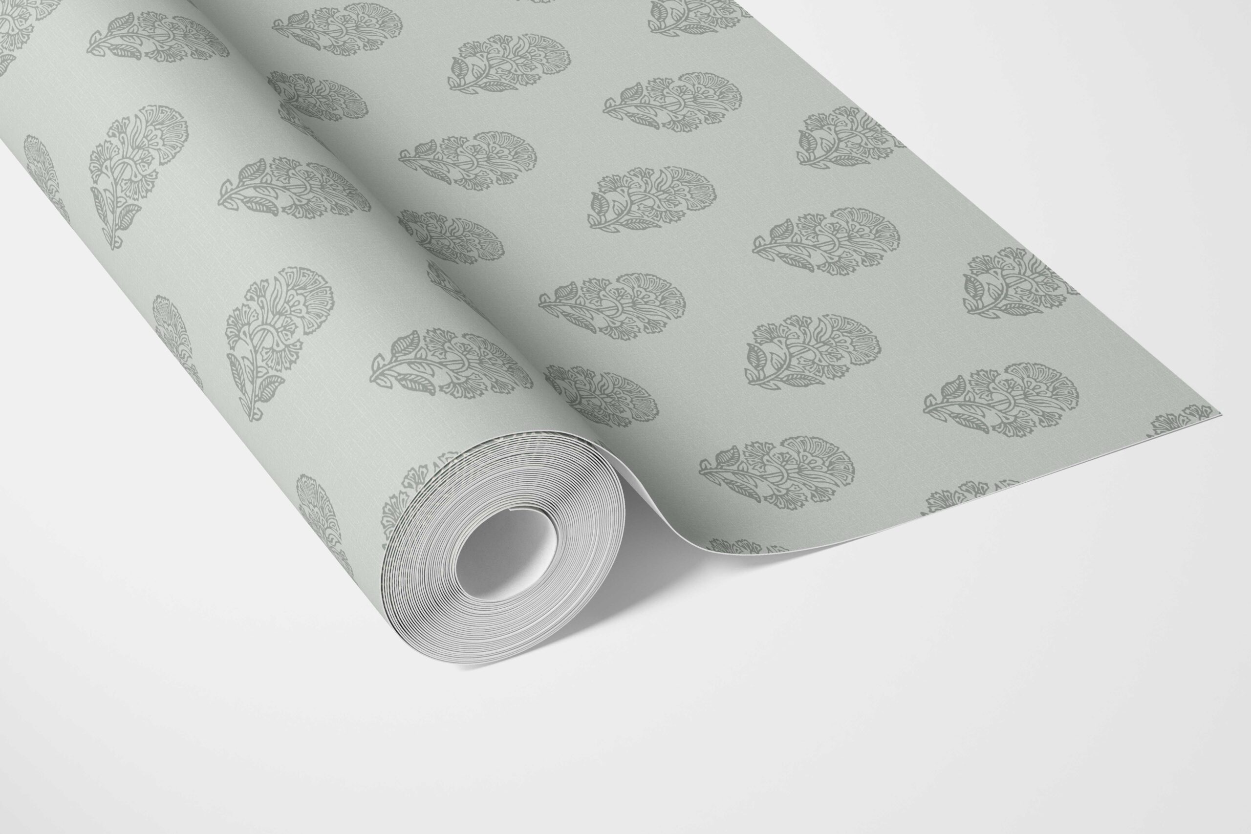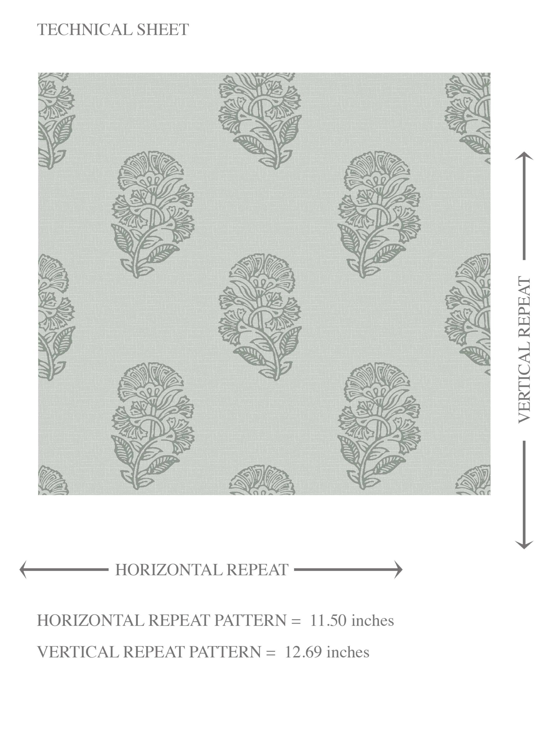‘Kurkum’ Botanical/ Floral Block Print Wallpaper (Sage Gray-Blue)