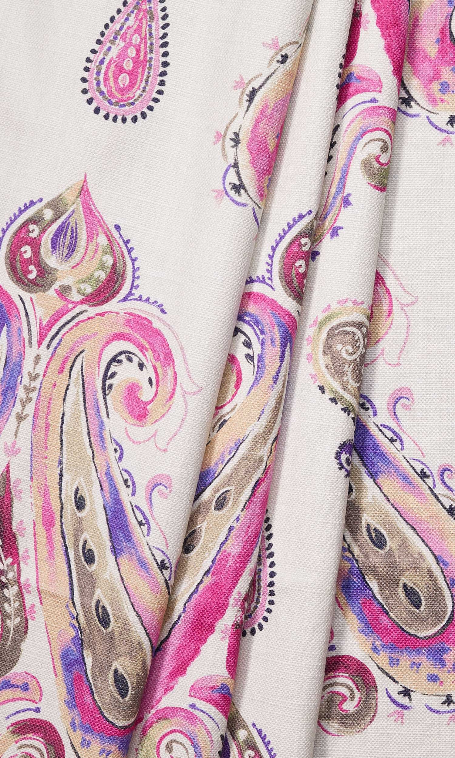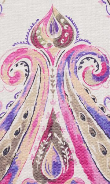 Traditional paisleys take an eye-catching avatar in this fabric. A charming palette of springtime pinks and purples with touches of brown and black on a pristine white backdrop looks absolutely magnificent. Simply perfect if you want to raise your room’s elegance quotient!
