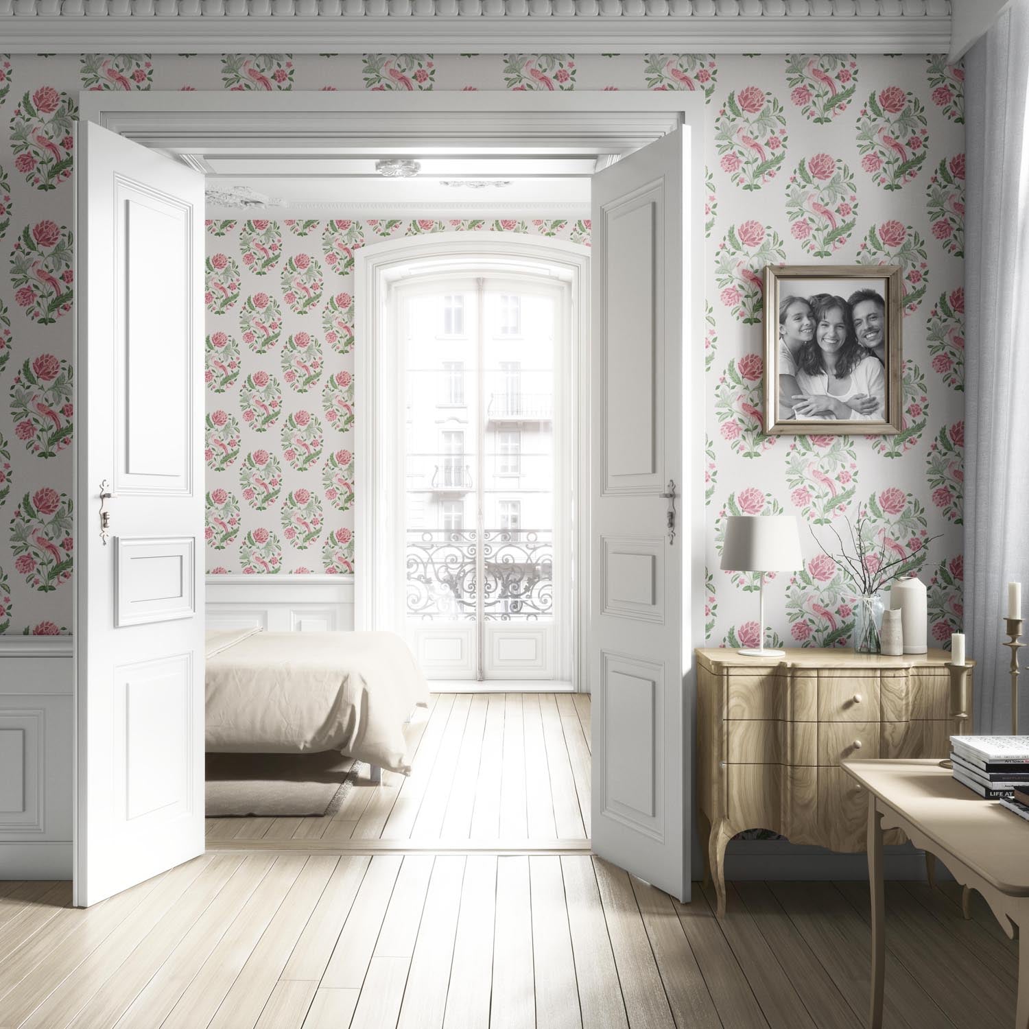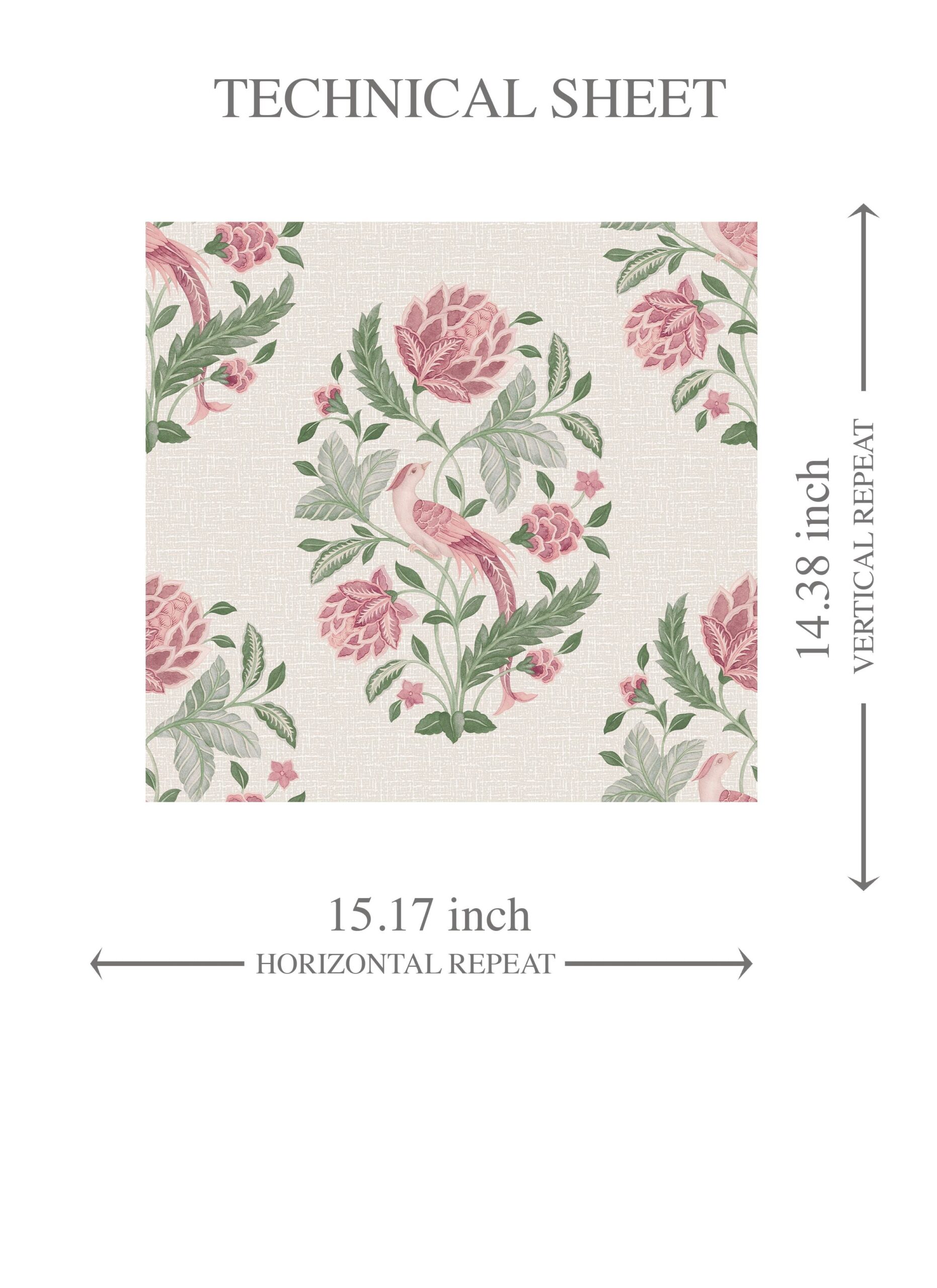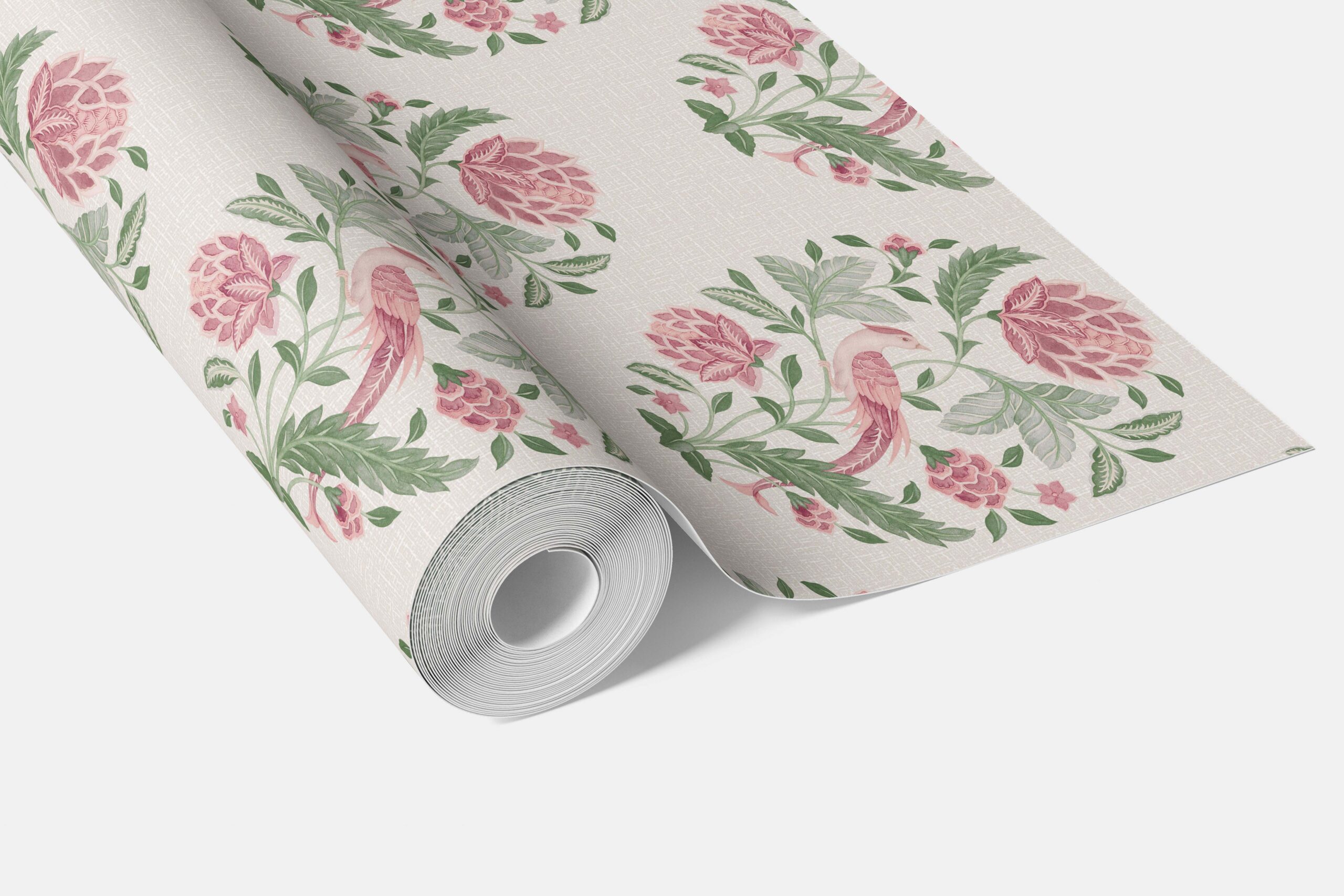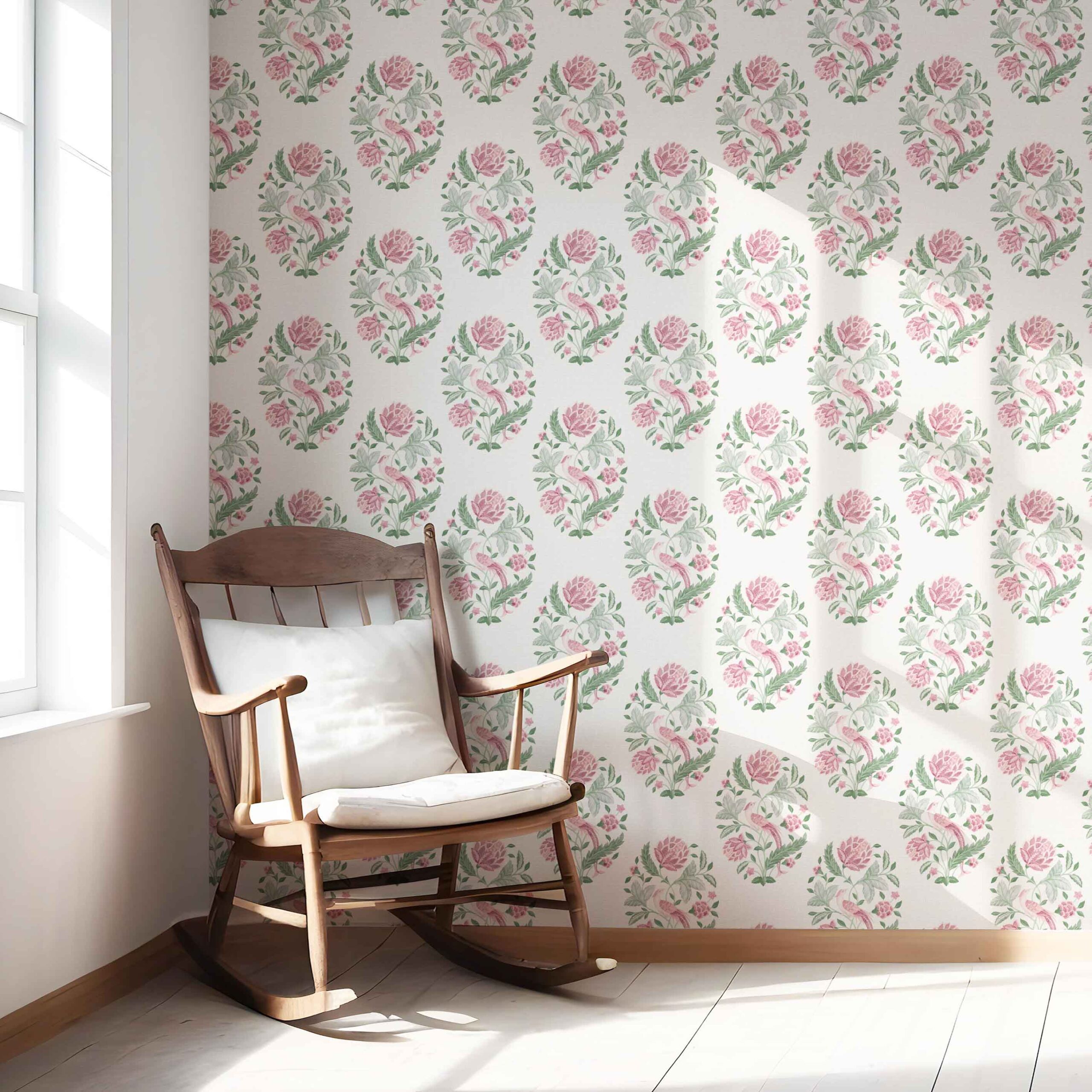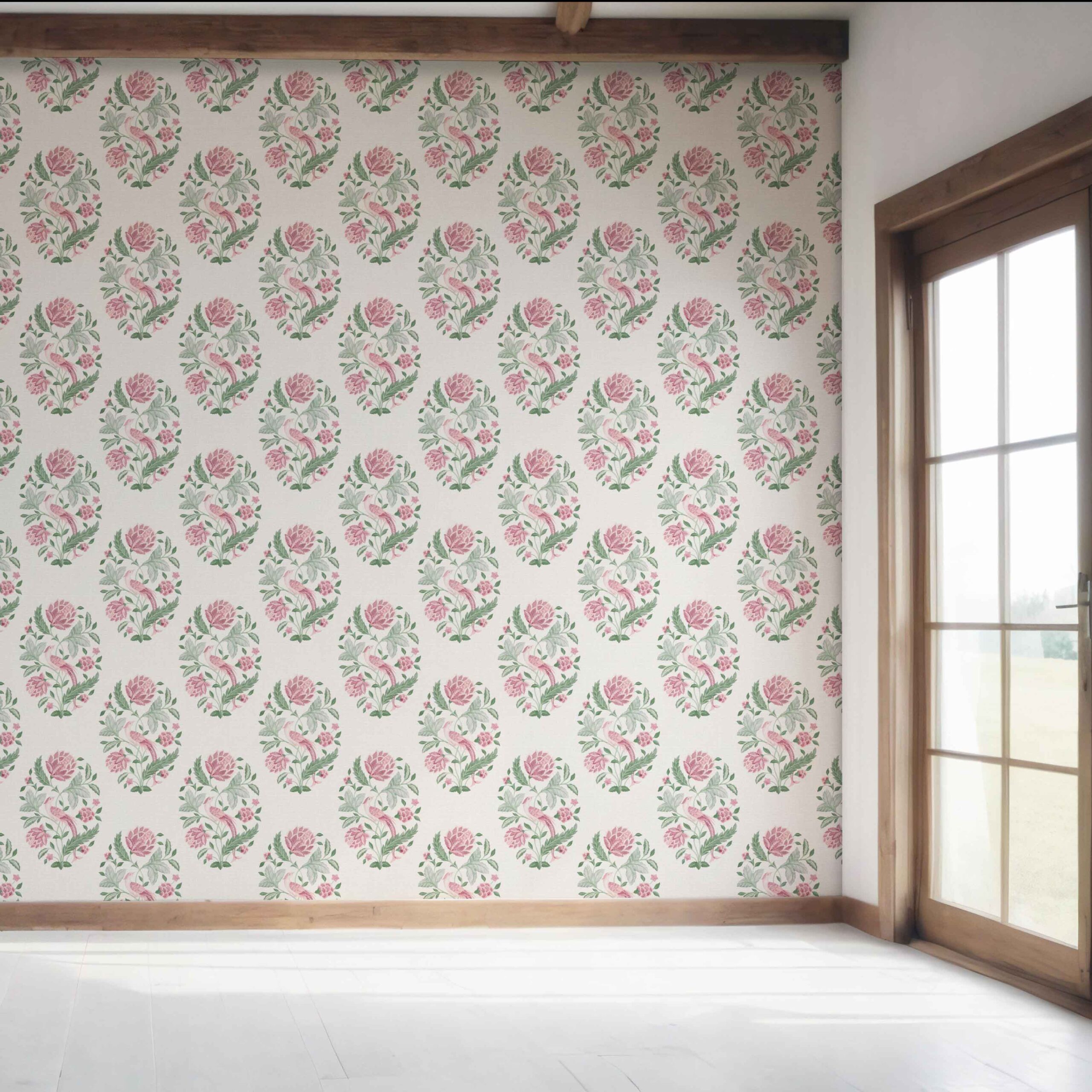 ‘Lausen’ Birds/ Floral Block Print Wallpaper (Pink/ Green)