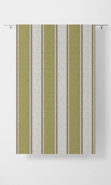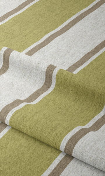 Featuring the most cheerful palette, this sunny fabric is made for cozy kitchens and inviting dining rooms. It boasts a trend-right colorway of apple green, linen white and cool brown, complemented by a bold pattern of wide and slender repeating stripes. Its green lends it a pop of pizzazz, but not so much to detract from other elements at play in your decor. Its designer flair makes it suited to upscale looks as well as relaxed, contemporary settings.?