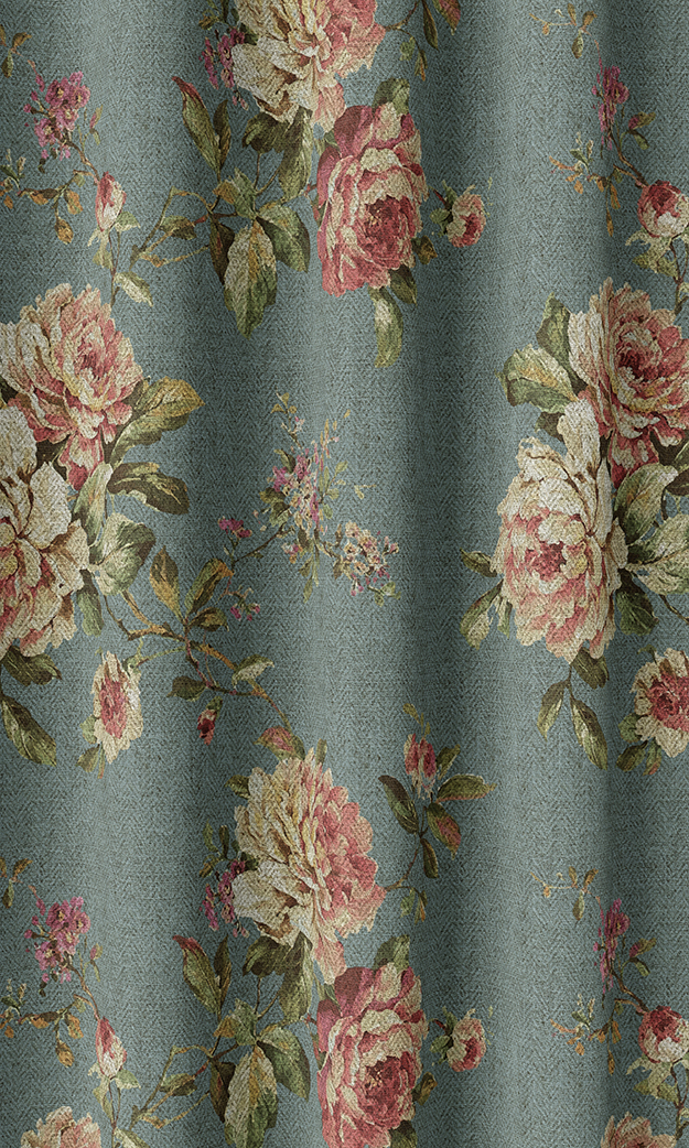 A fabric that makes you hold your breath for a second! Bring the feel of a flower-scented garden to your home with window treatments featuring elegant posies of blush roses. The traditional motif spells vintage delight with a warm country vibe, and the trend-right color palette renders a modern sophisticated touch. The grayish-blue background and the grand sizing enable the fabric to find its suitability in both traditional and contemporary spaces.
