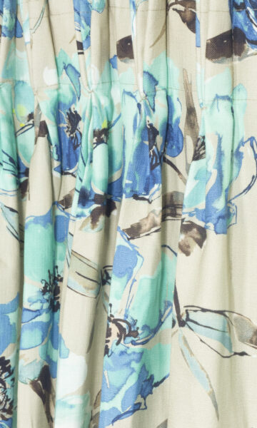 Cotton with a modern twist on florals. Fresh and spring-like – on a stunning palette of blues and beige, the floral design is definitely on the larger than life side while the colorway is gentle and soft. It’s a mixed bag that works so well. Perfectly and utterly elegant.