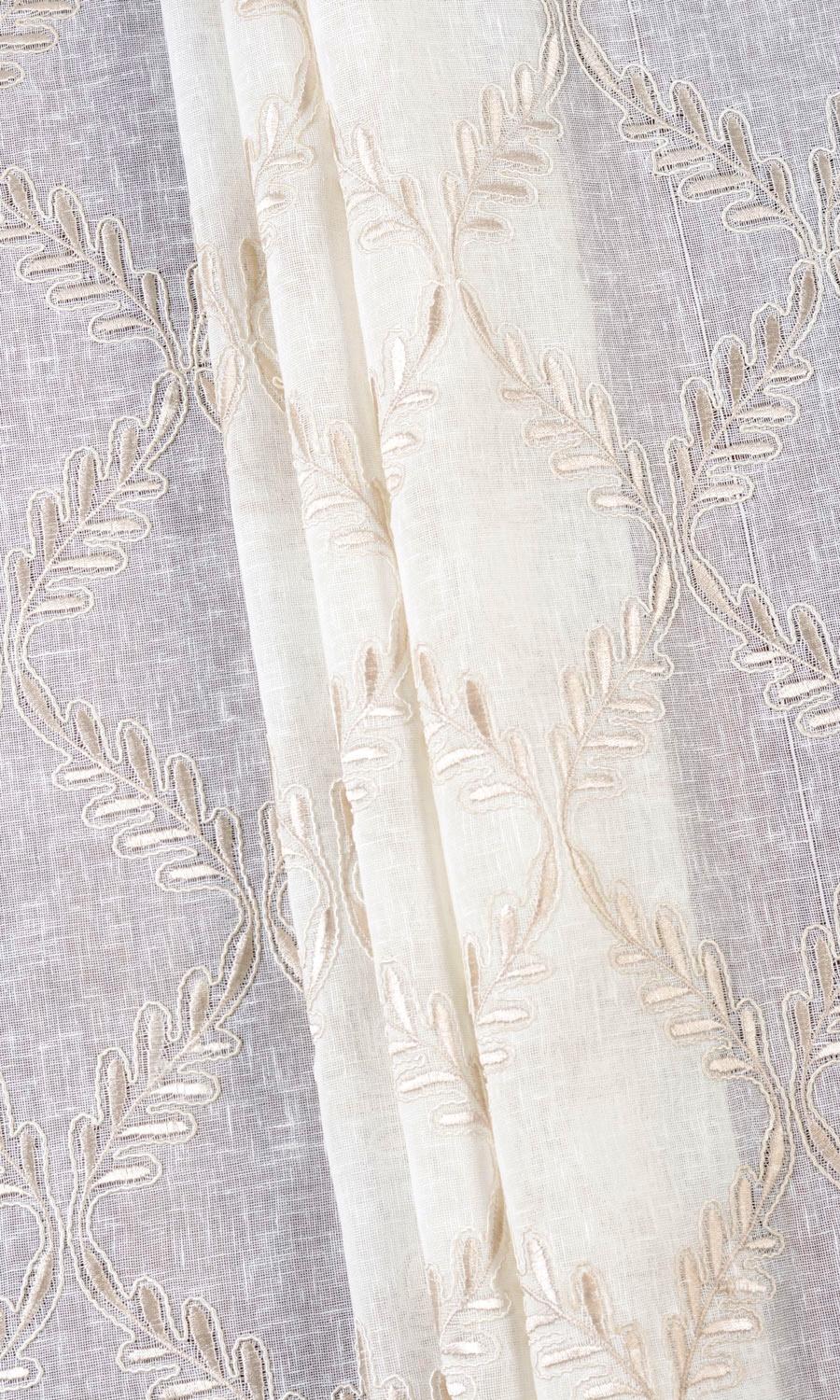 White sheers with a happy twist! ‘Botanical’ meets ‘geometrical’ in the embroidered rowan leaf motifs arranged to form a string of diamonds in this lovely fabric. The light beige-white combination helps to further a neutral color theme as well as to offset the vibrance of a color-filled scheme. Versatility at its best!