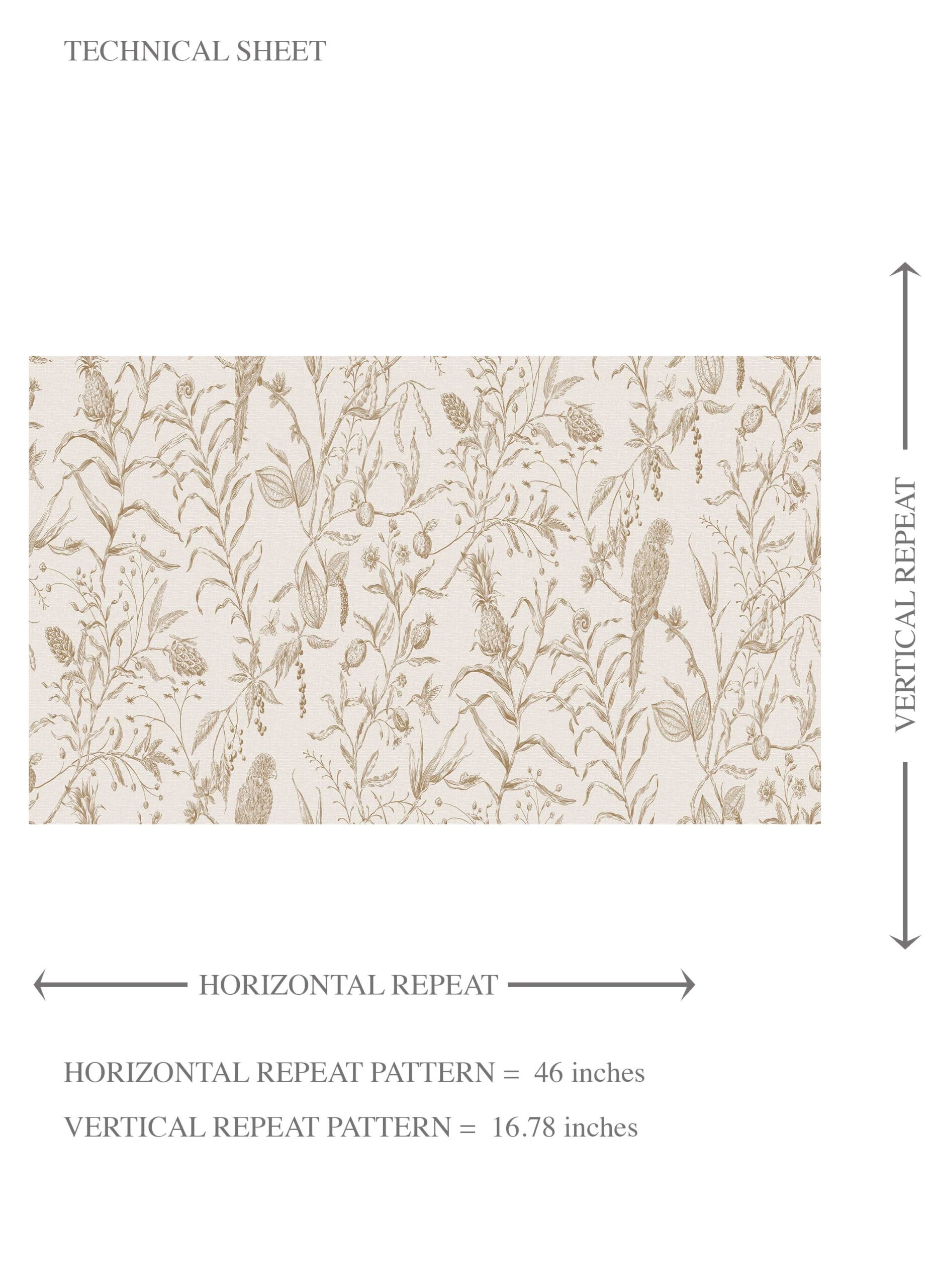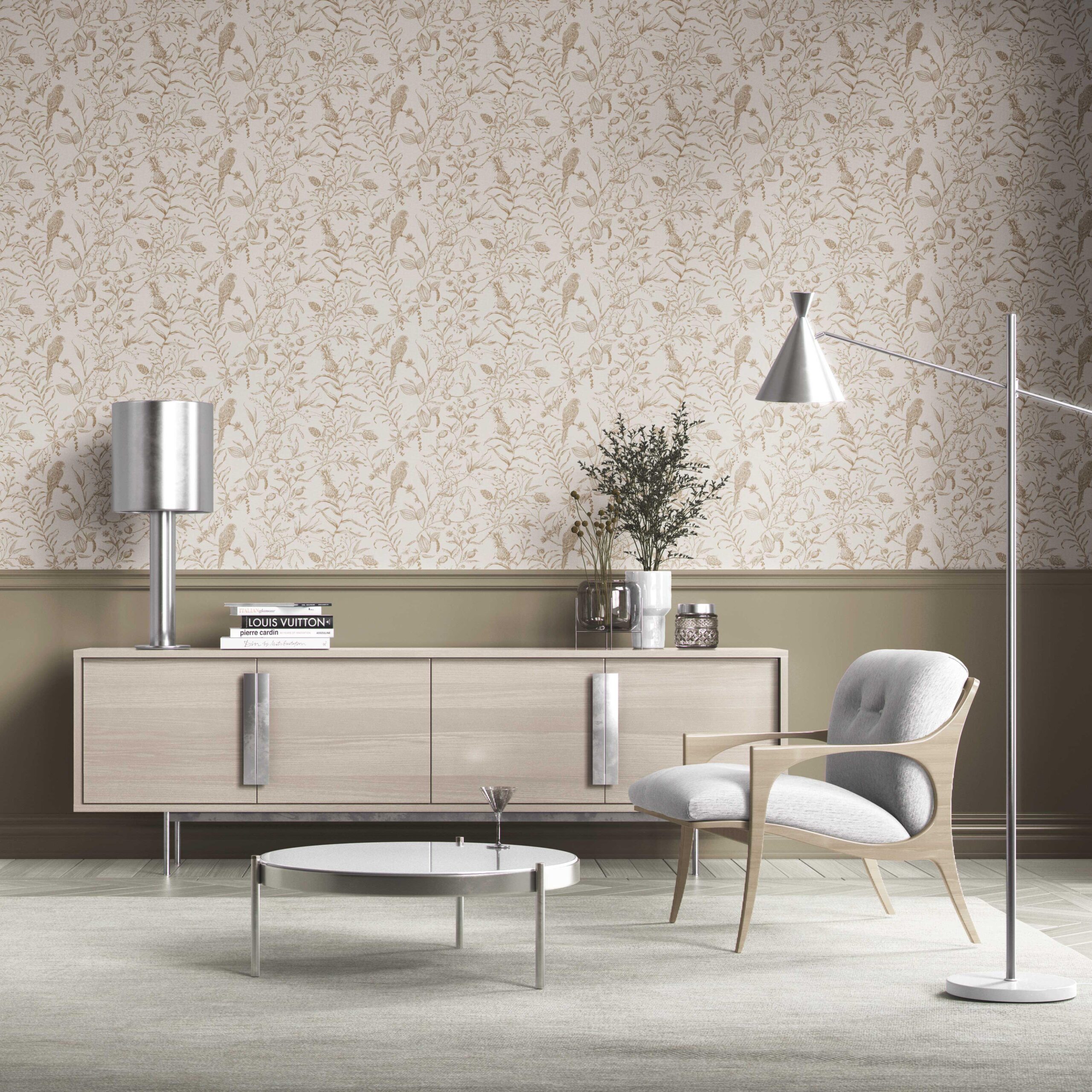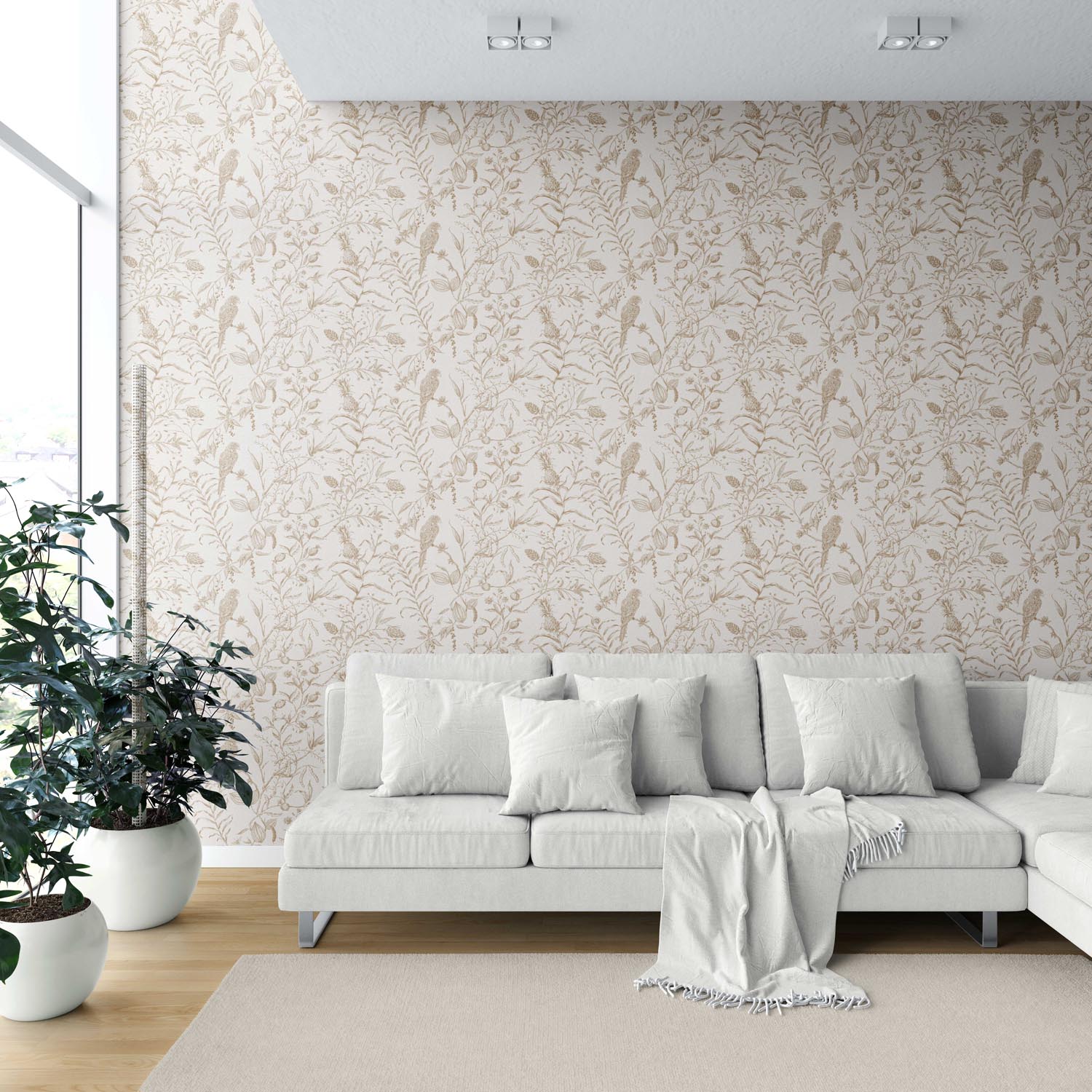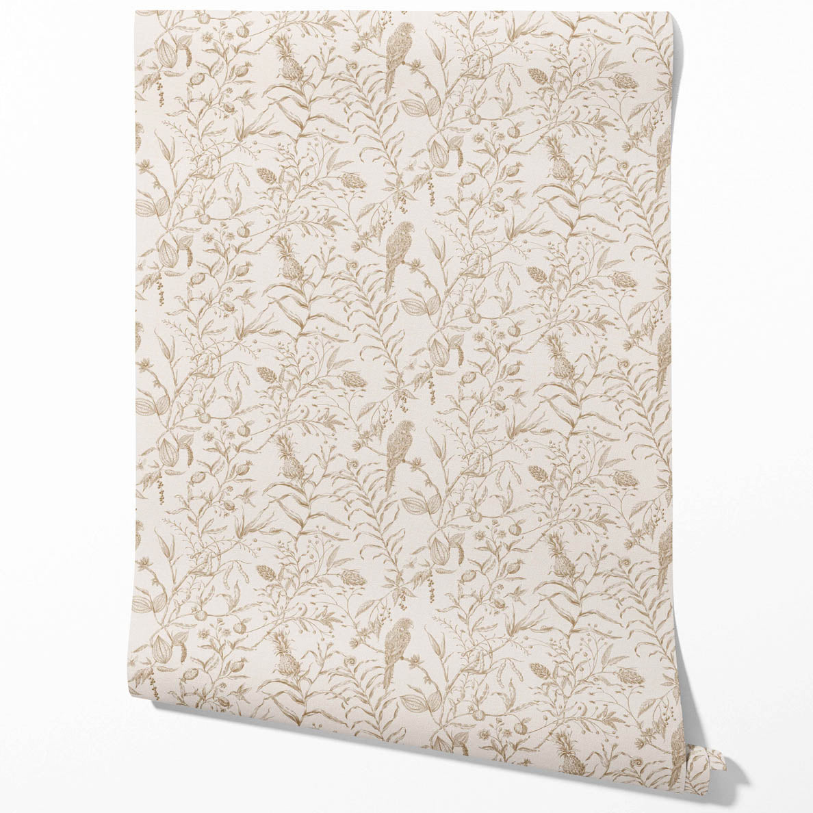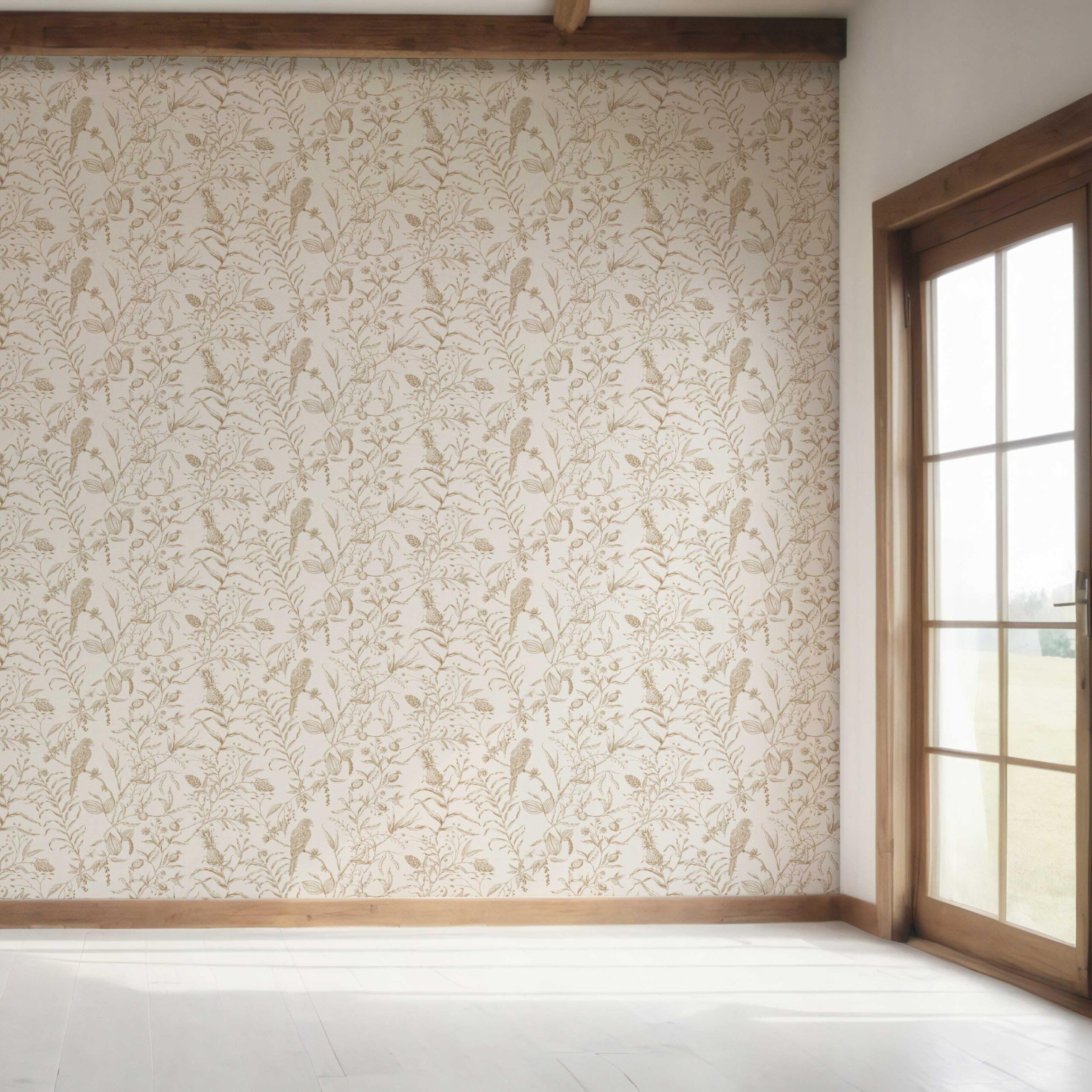 ‘Lunaria’ Birds Print/ Botanical Wallpaper (Beige/ Brown/ Warm Gray)