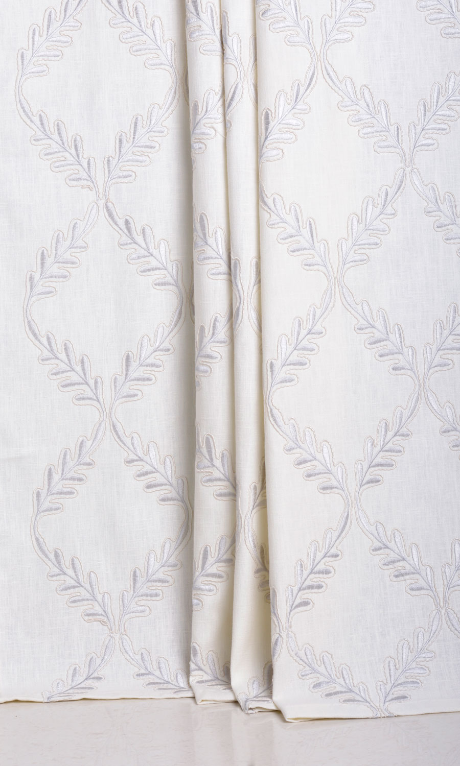 Those who love geometric patterns as passionately as floral designs can now gratify their design aspirations in this linen-blend. Slender sprigs move rhythmically from top to bottom caving in at intervals to form a harlequin pattern. Window treatments in this white fabric with tone-on-tone silvery-white embroidery make a gorgeous visual treat with subtle contrasts.