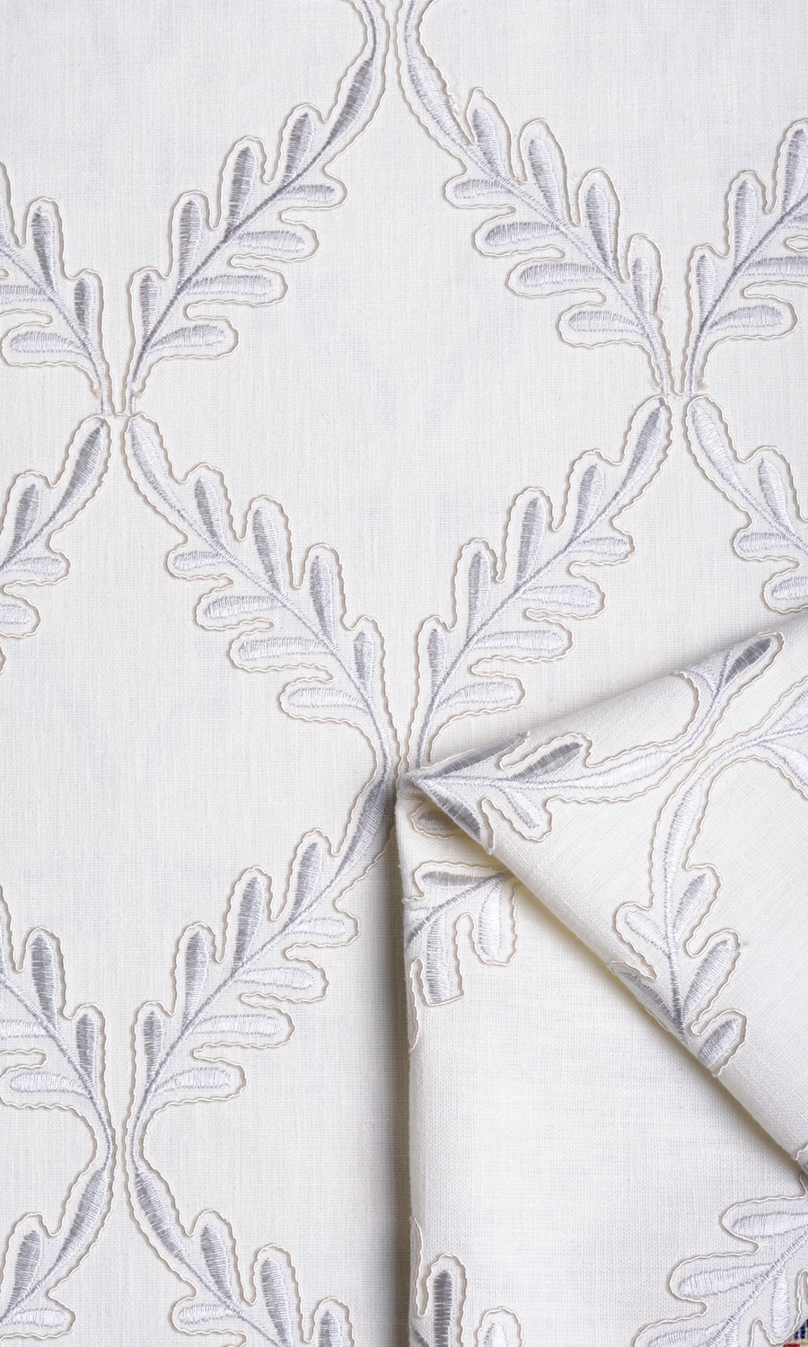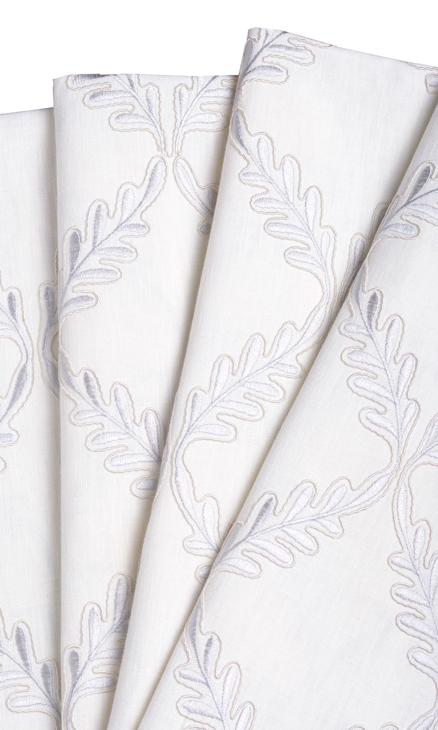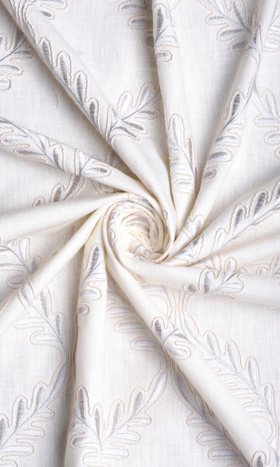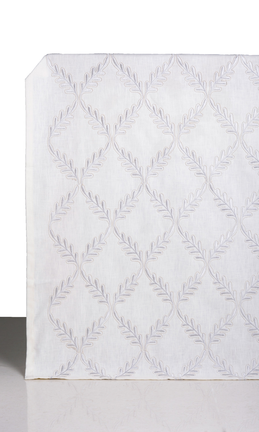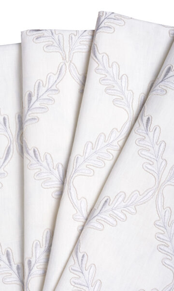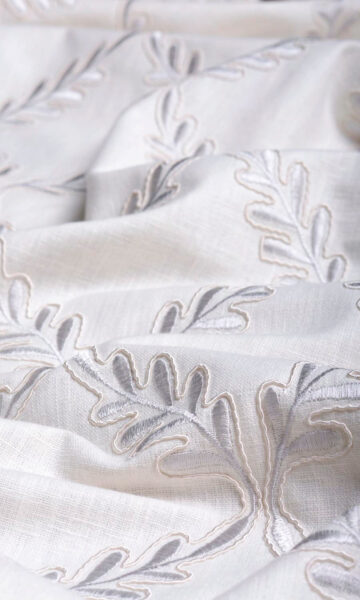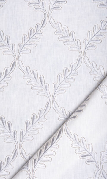 Those who love geometric patterns as passionately as floral designs can now gratify their design aspirations in this linen-blend. Slender sprigs move rhythmically from top to bottom caving in at intervals to form a harlequin pattern. Window treatments in this white fabric with tone-on-tone silvery-white embroidery make a gorgeous visual treat with subtle contrasts.