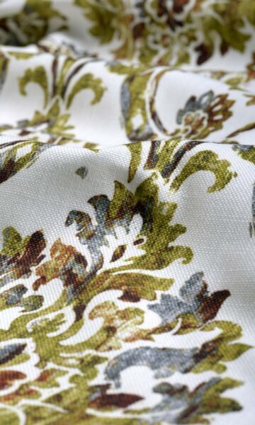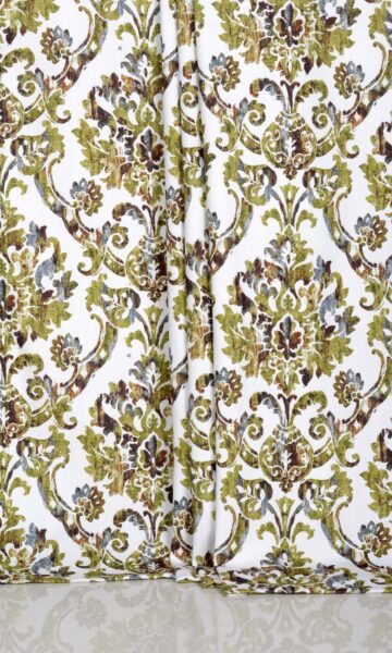For elegant window treatments that must also make a strong visual impact, this immaculate piece of luxe beauty is on offer. Bearing the traditional and much-revered damask motif in olive green, brown, and grey on a white backdrop, this fabric is best described as an enchanting beauty. Drapes and roman shades in this bold patterned fabric are ideal for traditionally-styled large rooms and open-plan houses.