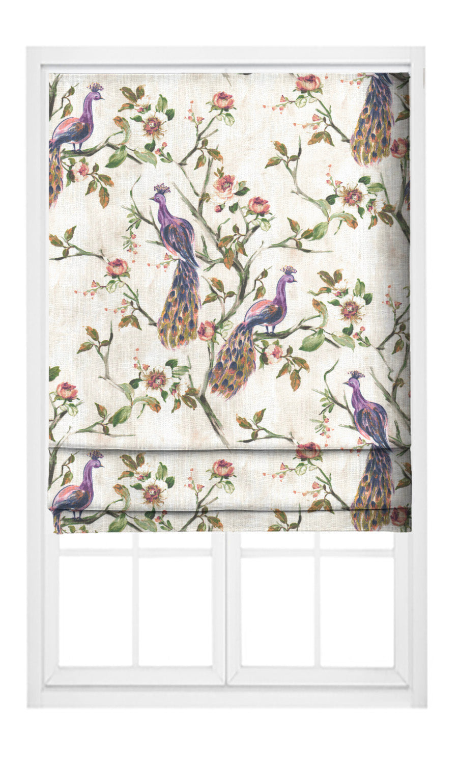 Bring a feel of French outdoors into your interiors with this pretty number. Created with an autumn palette of soft greens, yellows and pinks highlighted with purple and indigo on a white background, its peacocks and wild roses print is always a la mode. Rustic yet ravishing!