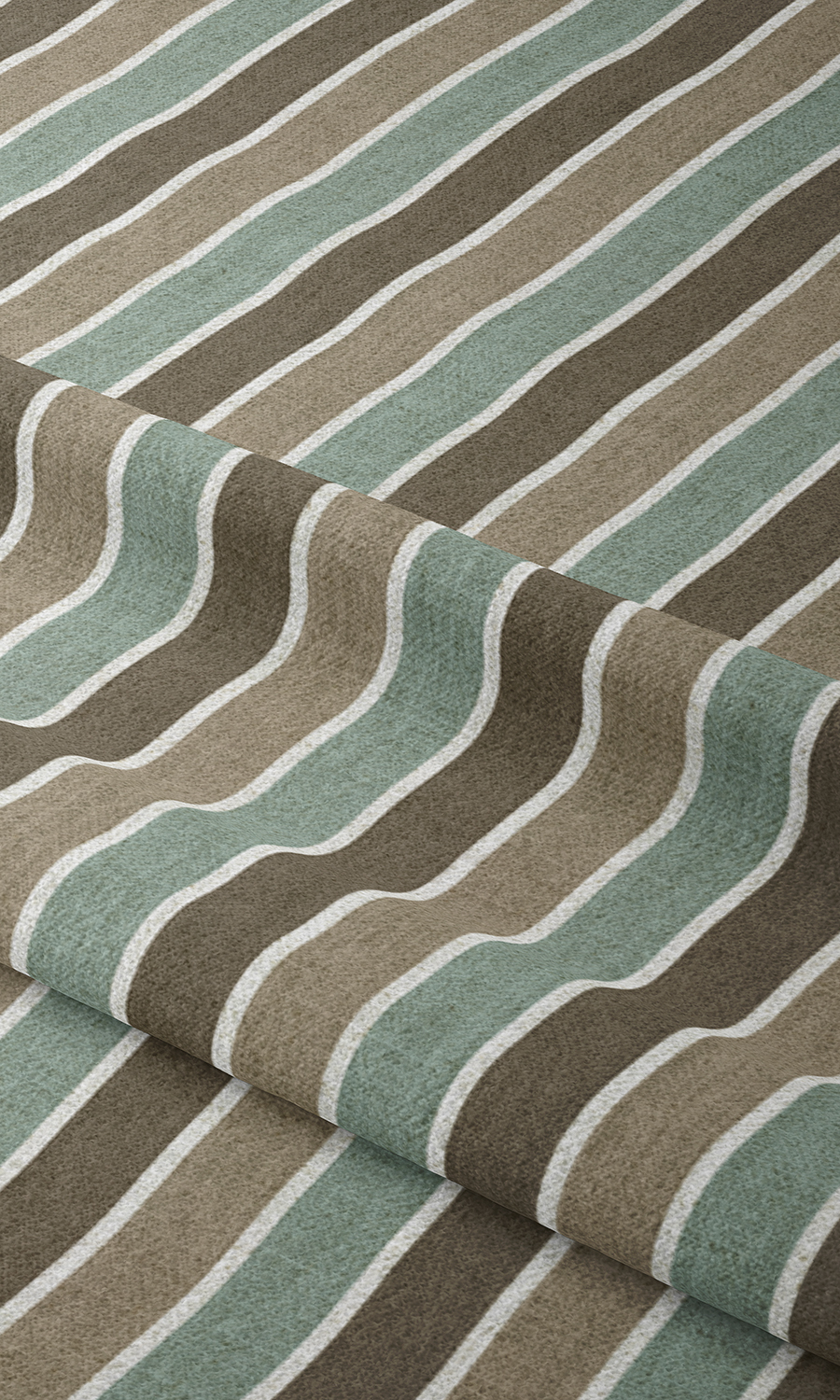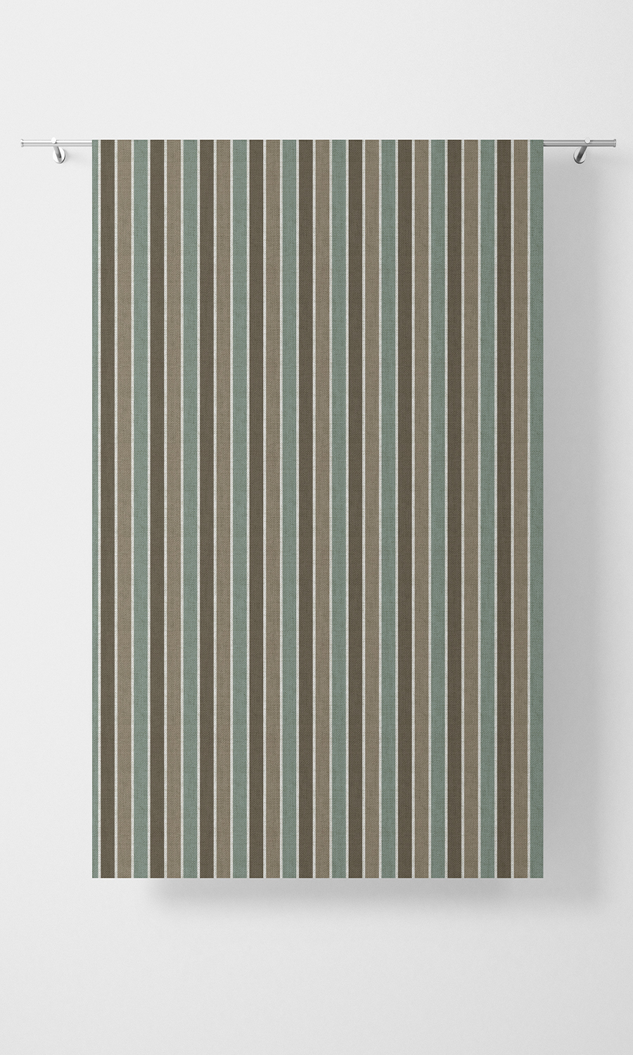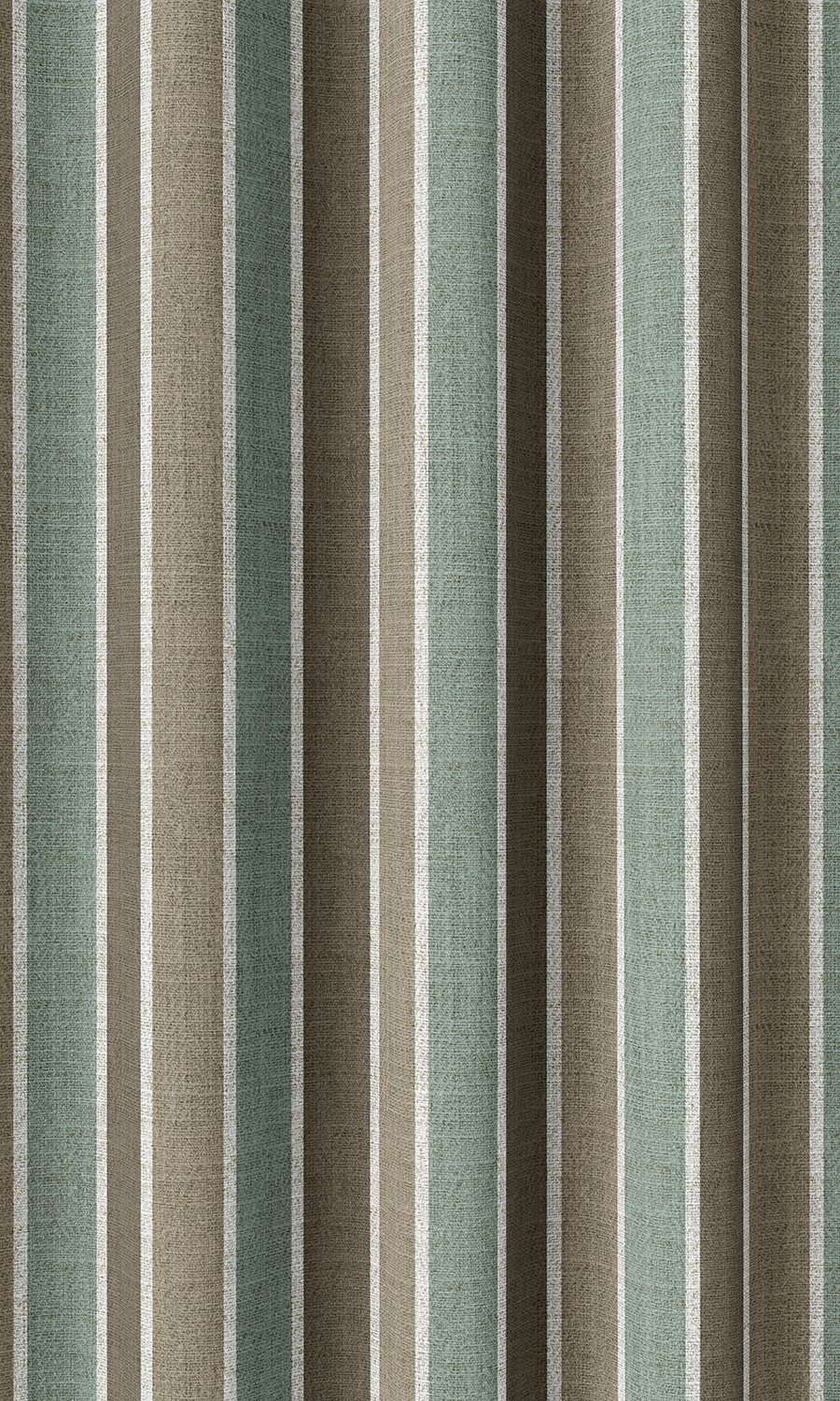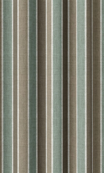 Add sanctuary style to your living room with this alluring fabric. ‘Miami Jade’ is printed on a texturally rich, herringbone weave base and features a soothing color palette in soft shades of cadet blue, cedar brown, and eggshell white. Its repeating stripes enliven its look to balance with its calming tones. Use it for flat panel roman shades for your master bedroom or a casual heading styled drape for your living room. It’s especially fitting to evoke a seaside, forest pool, or cottage garden aesthetic for any room.?