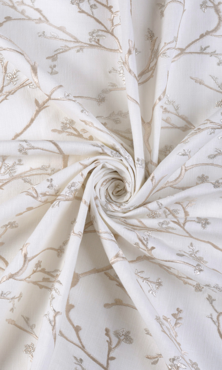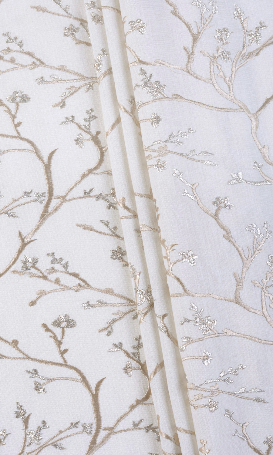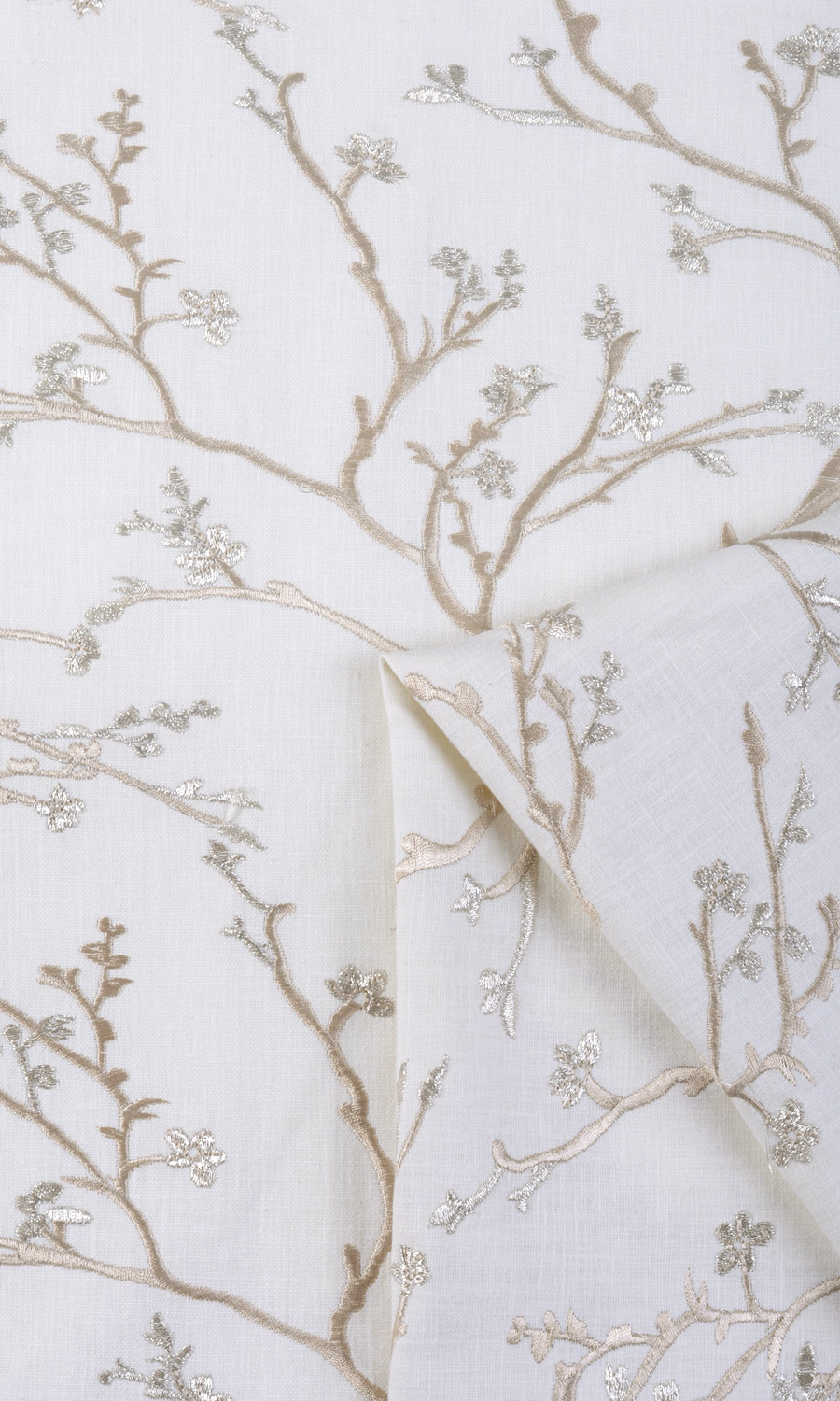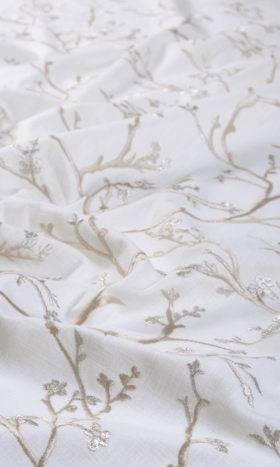 Morlaix is for those who prefer a majestic touch in their interiors. The base ivory fabric is a beautiful blend of cotton, polyester and viscose that has been embroidered with an ornate floral vine pattern in pale beige. Sophisticated with just a hint of sumptuousness, this fabric works well for formal spaces.