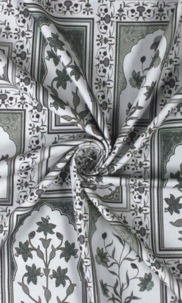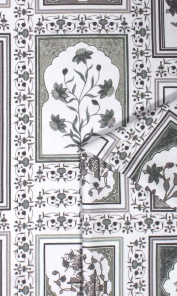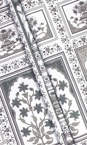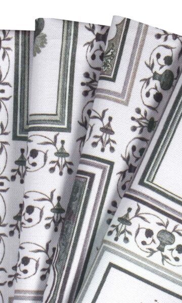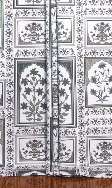 Oriental theme in a modern color scheme. Naaz offers a sneak peek into India’s extravagantly detailed art forms and architectural marvels through a monochrome lens. It combines the florid beauty of Mughal-style hand-painted floral designs and intricately embellished ‘jharokhas’ – the ornate oriel windows of classical Indian architecture. Add an eclectic dimension to your decor with this exotic cotton blind.