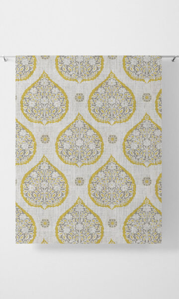 Welcome home a marvel from traditional Indian art with this classic fabric featuring ancient Mughal motifs in a modern palette of gray and lemon yellow. Large cordate leaves interspersed with tiny scattered blooms offer an intriguing contrast of proportions while the narcissus shrub enclosed within the leaf delivers intricacy with sophistication. Window treatments in this paisley-inspired fabric are self-assured statement pieces.