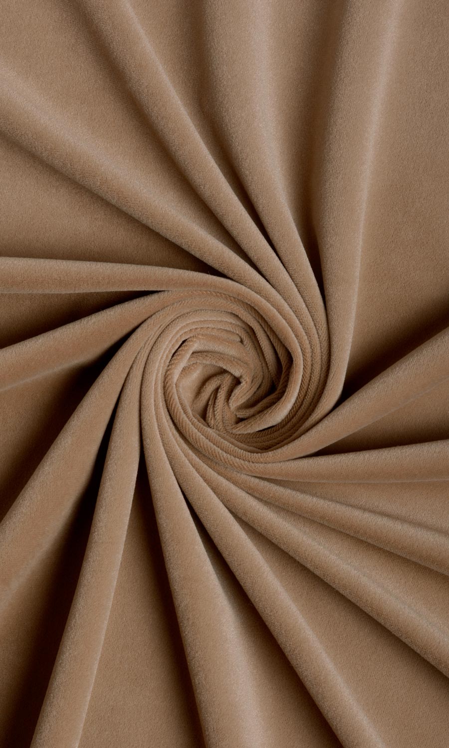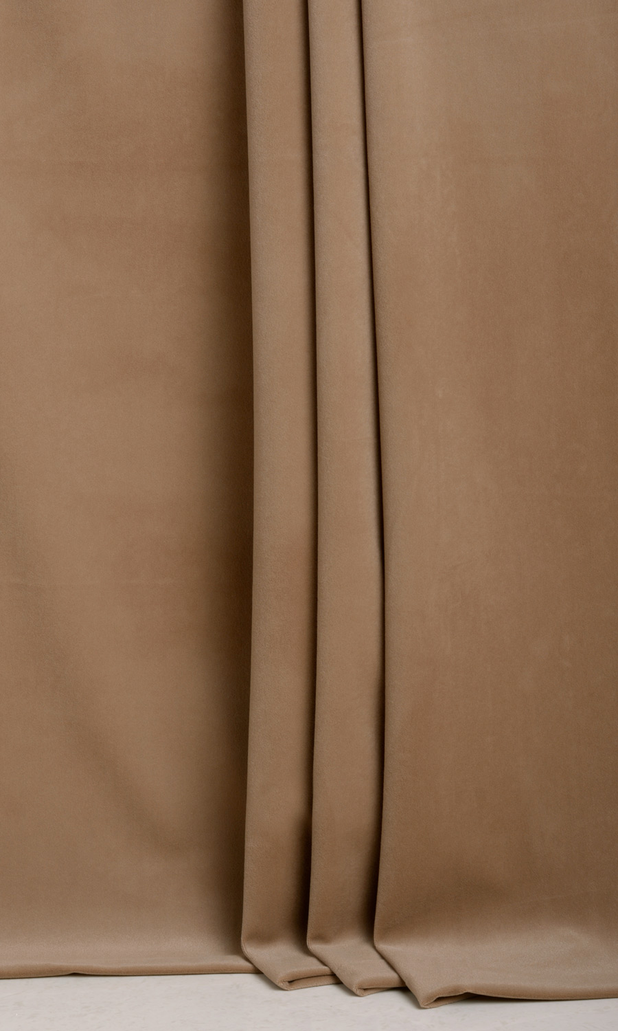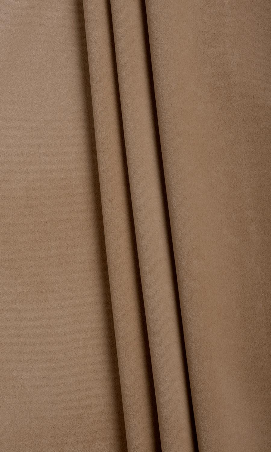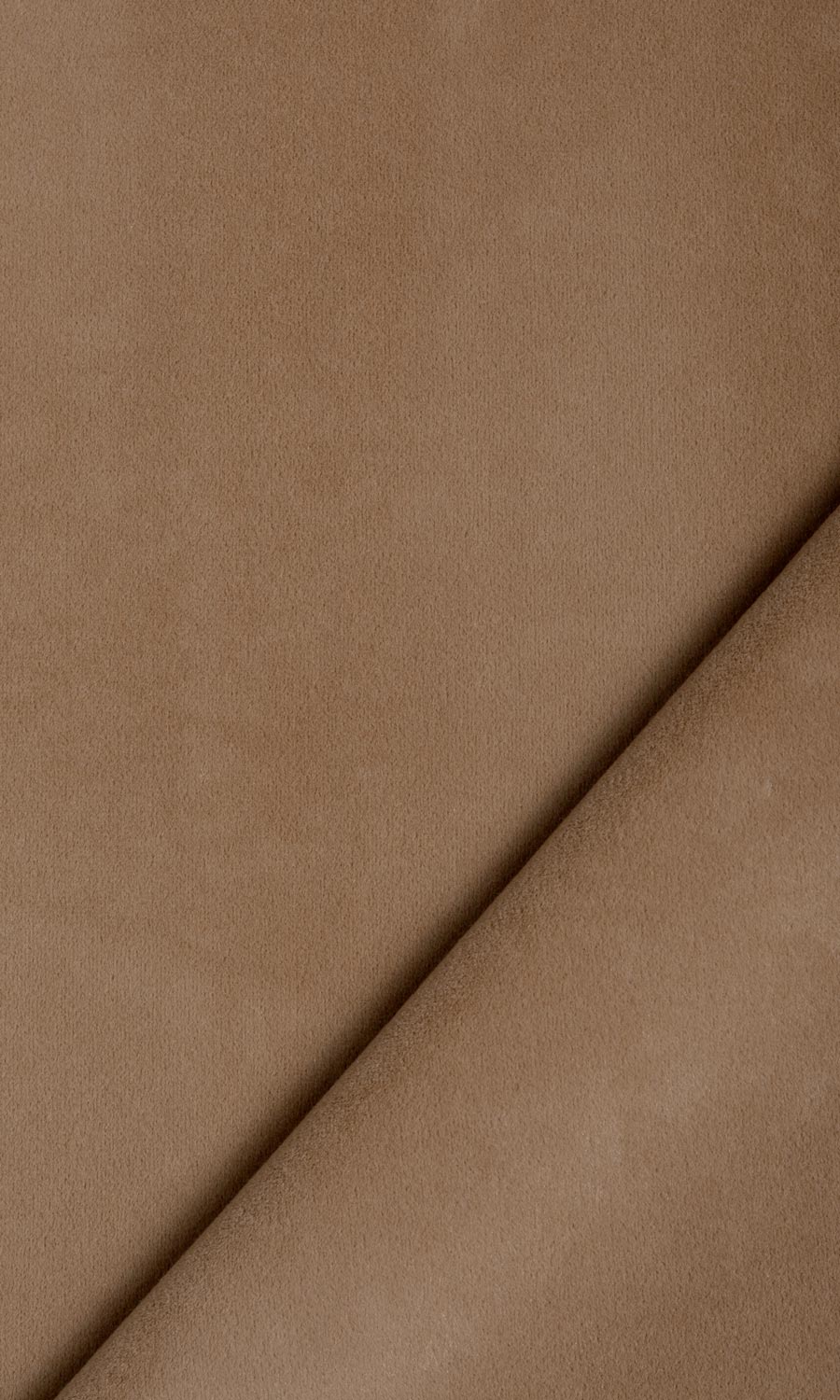 Give an organic vibe to your home with window treatments in this soft brown velvet. With immense versatility to blend with many hues, brown curtains and roman shades present a great opportunity for room styling. Dense naps translate light to various versions of tan, inviting touch to experience the tactility of this plush fabric. Our stylists recommend sewing this monochrome lovely in architectural styles such as pinch pleated drapes and relaxed roman shades.