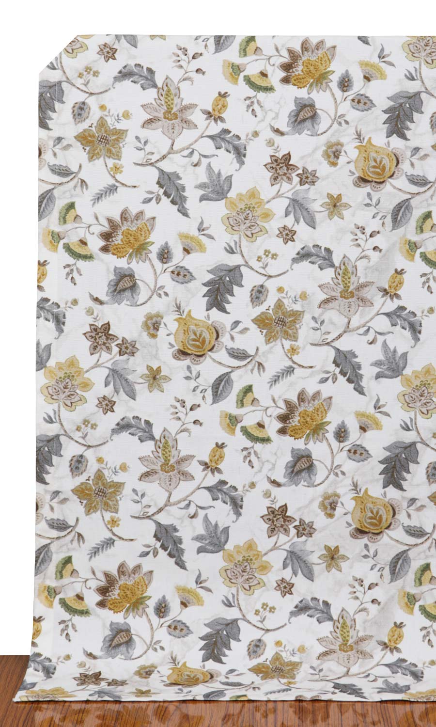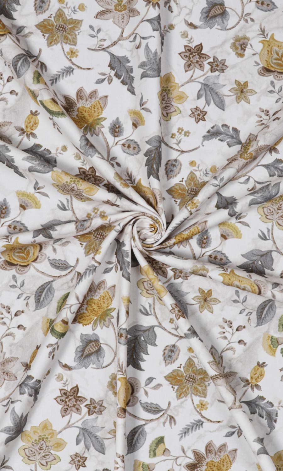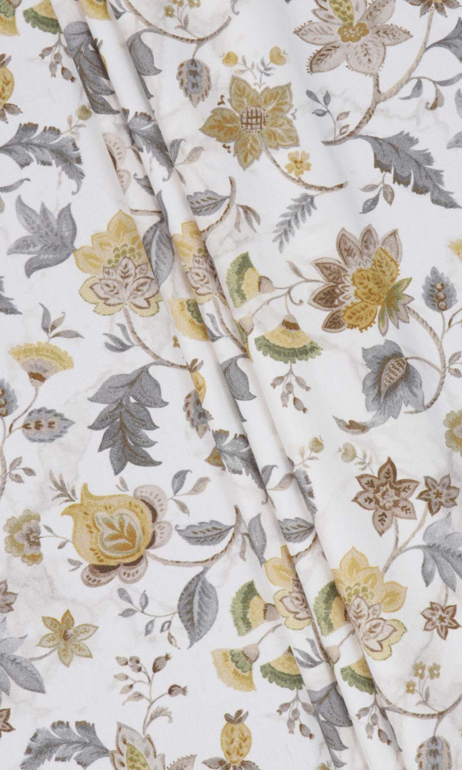 Subtle yet striking, this fabric brings traditional Indian floral motifs with curlicued details. Understated gray leaves recede to the background leaving the stage to delicate yellow-tinged flowers. Embodying eclecticism mixed with sobriety, Palki suits both detail-rich bohemian interiors and nature-inspired feminine spaces, embodying a blend of charm and subtlety.