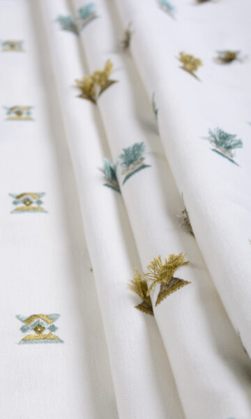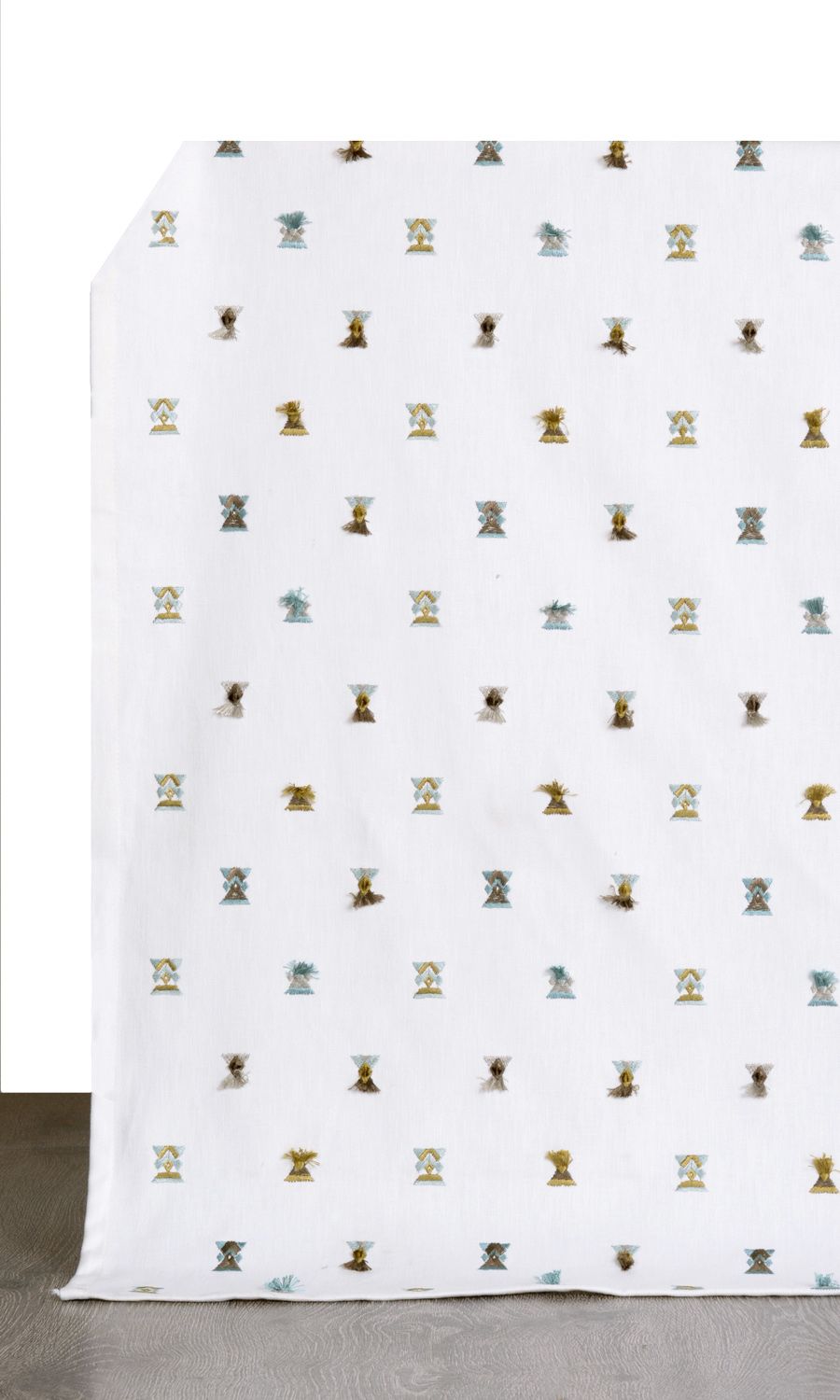 Piana is part poetry, part panache and pure luxury. Its white base fabric has been embroidered with multicolored geometric motifs in pastel shades of pale green and sky blue. Some of these have a slight tasseled look for a designer feel. Alternate and not-too-crowded placement of motifs creates a feel of visual harmony.