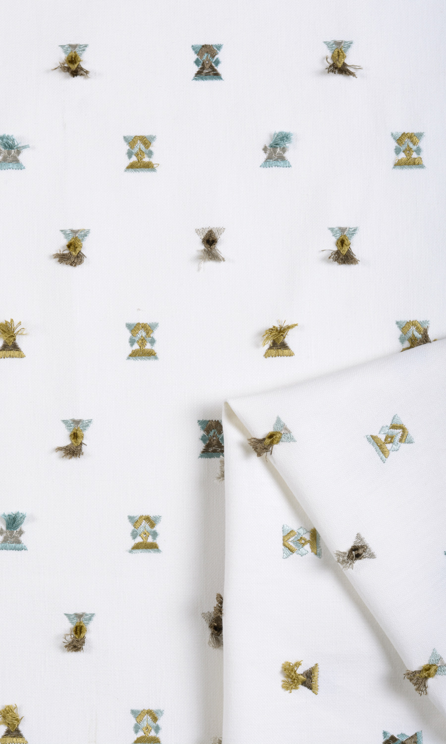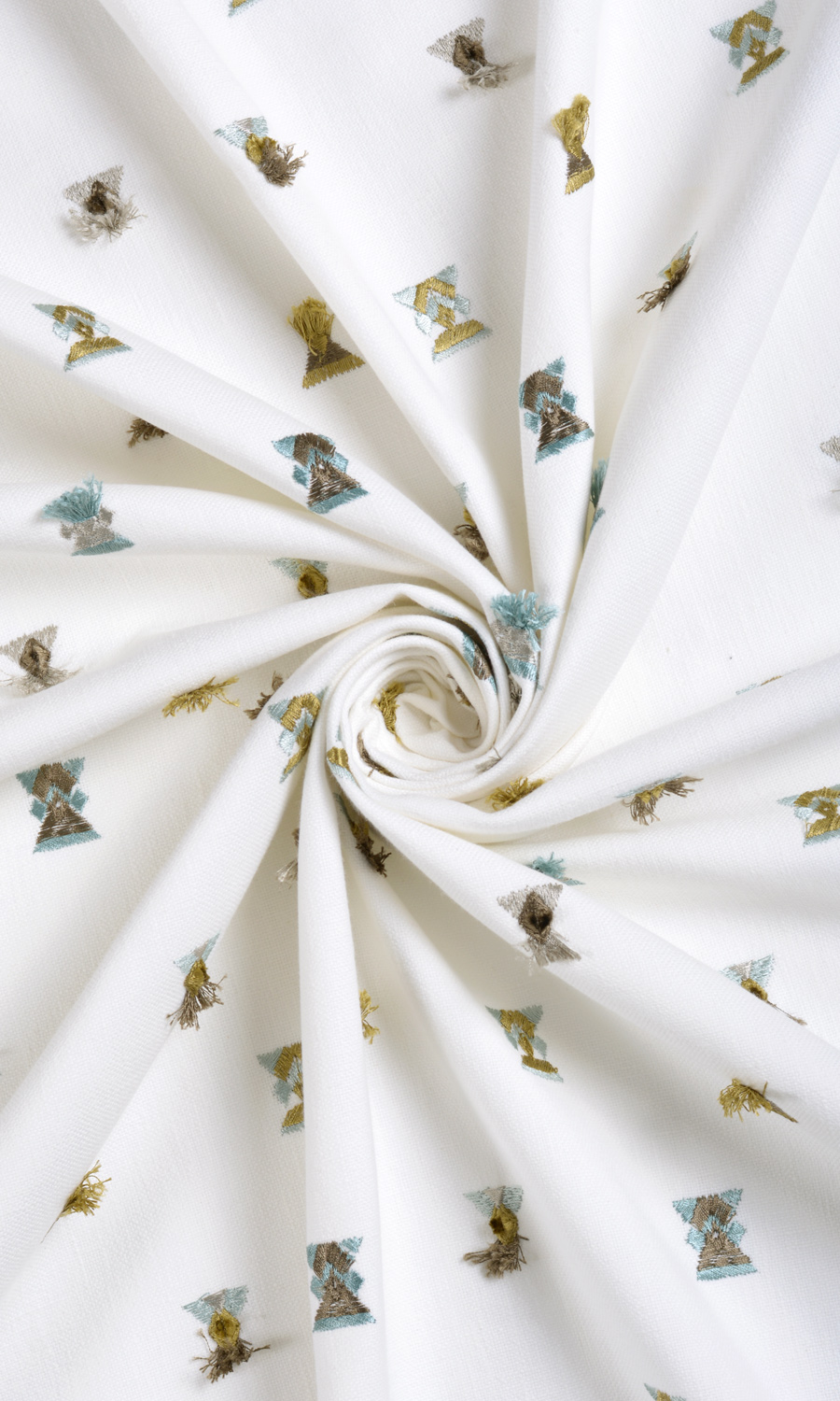 Piana is part poetry, part panache and pure luxury. Its white base fabric has been embroidered with multicolored geometric motifs in pastel shades of pale green and sky blue. Some of these have a slight tasseled look for a designer feel. Alternate and not-too-crowded placement of motifs creates a feel of visual harmony.