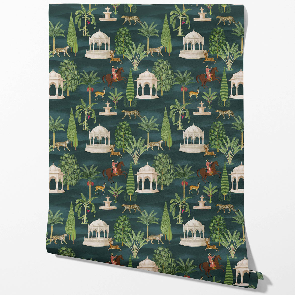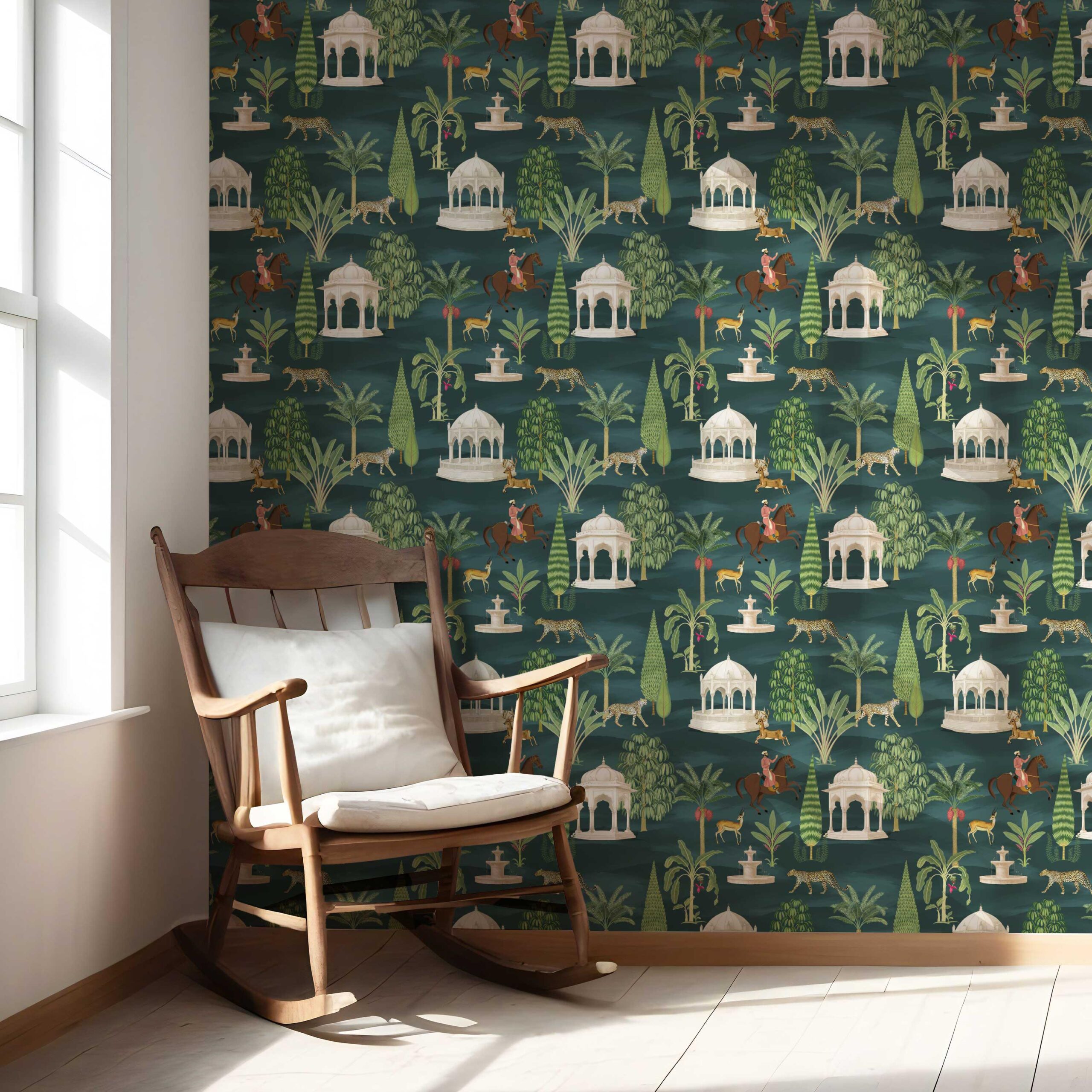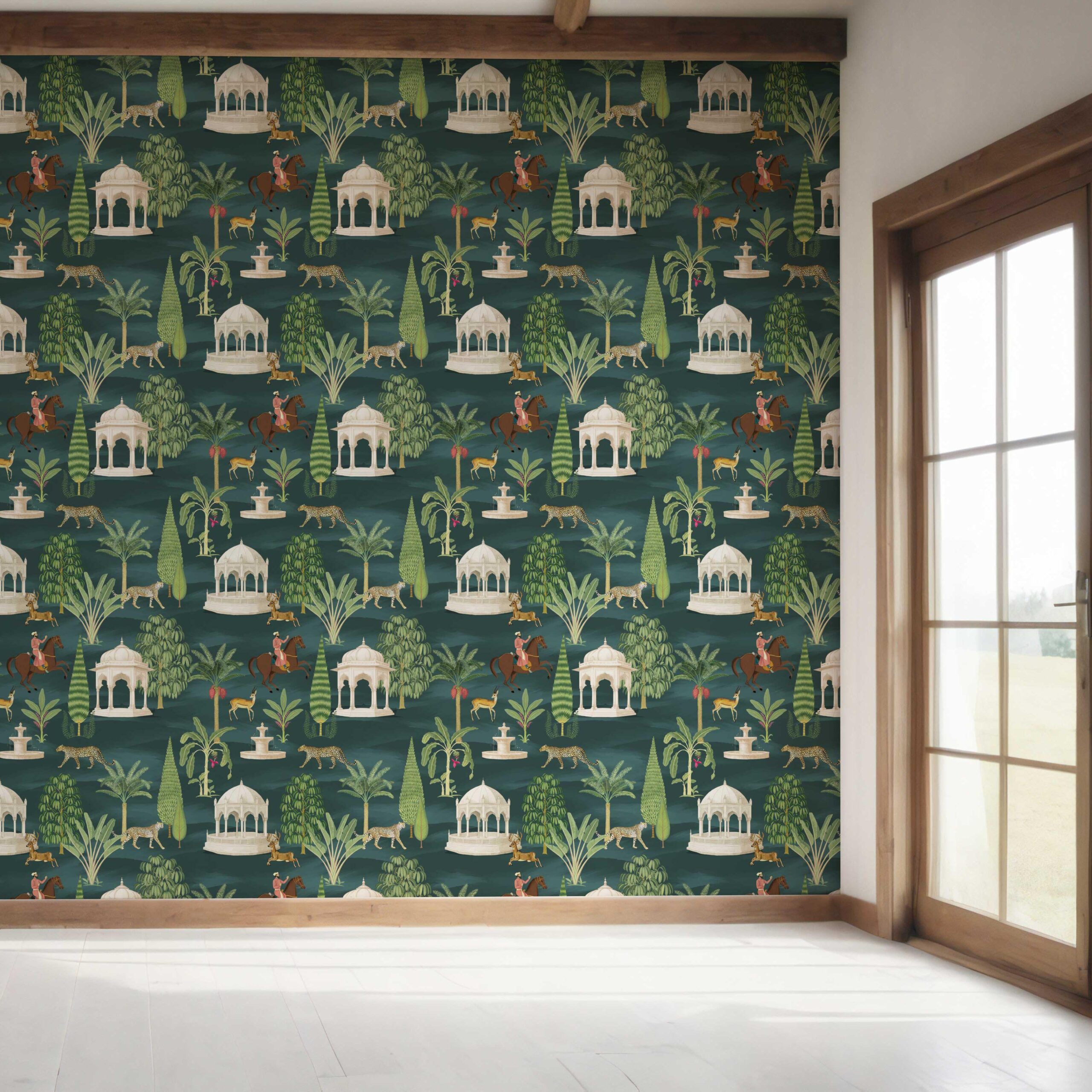 ‘Picturesque’ Vintage Heritage/ Ethnic Chinoiserie Wallpaper (Teal Green/ White/ Brown/ Red)