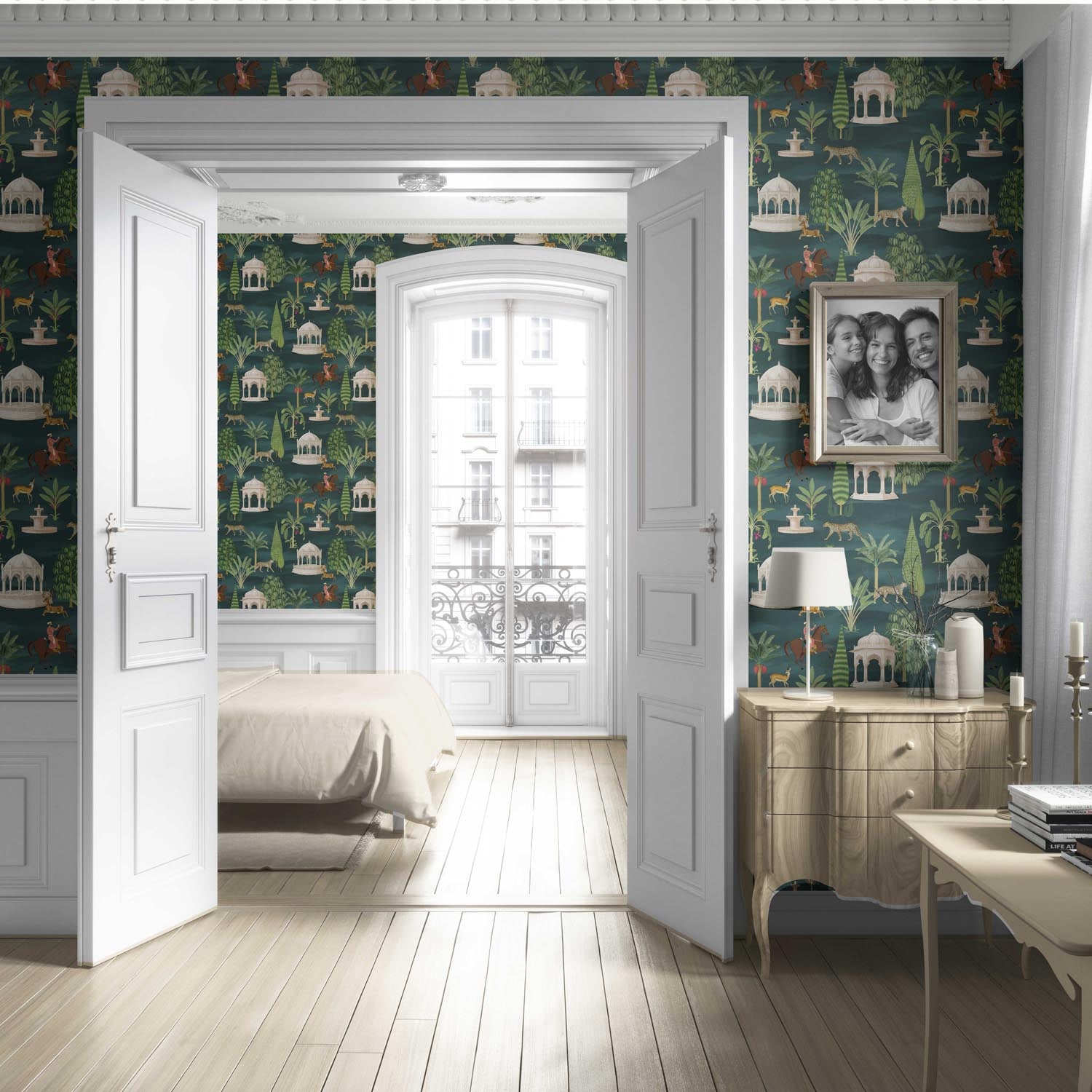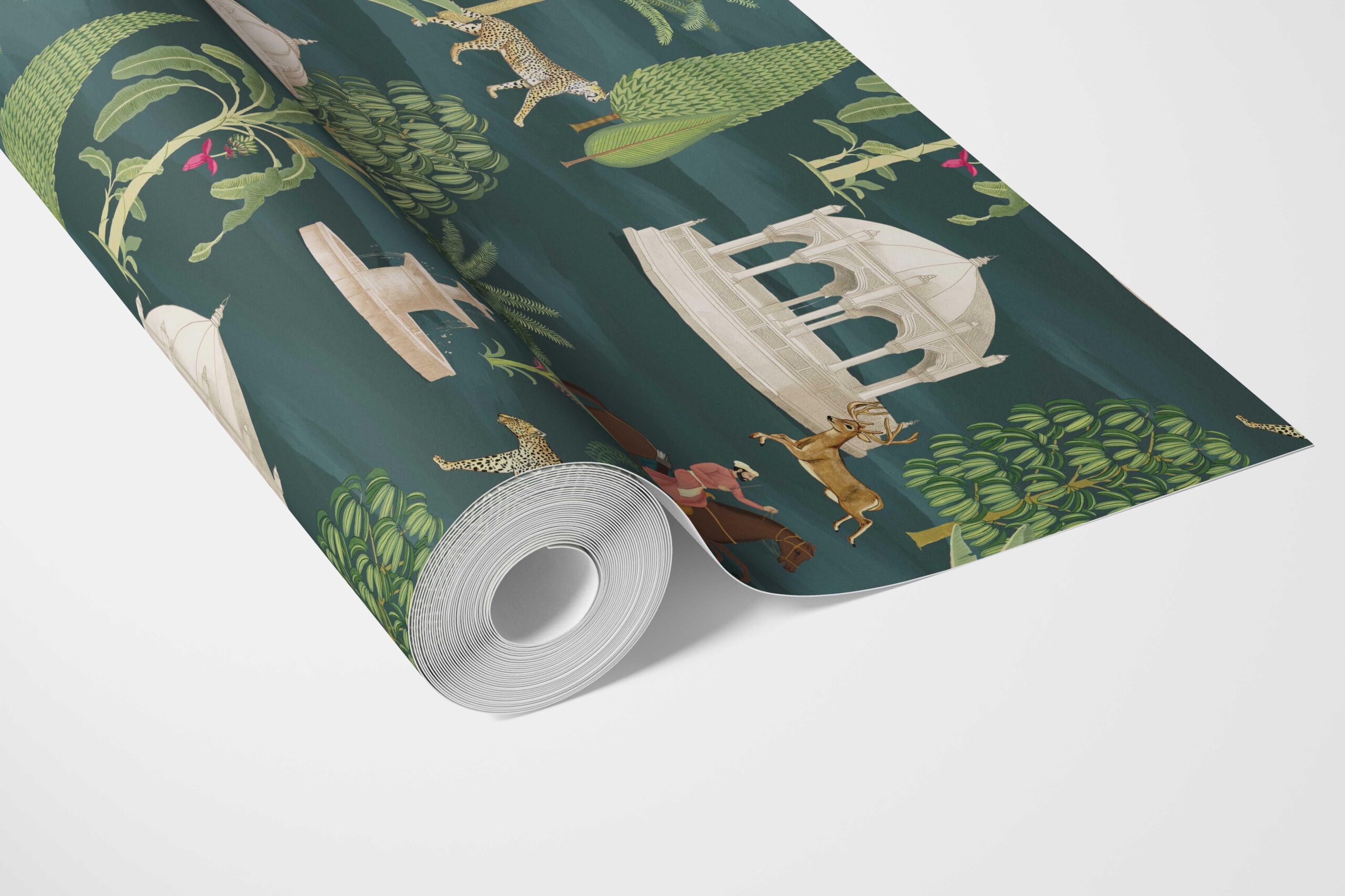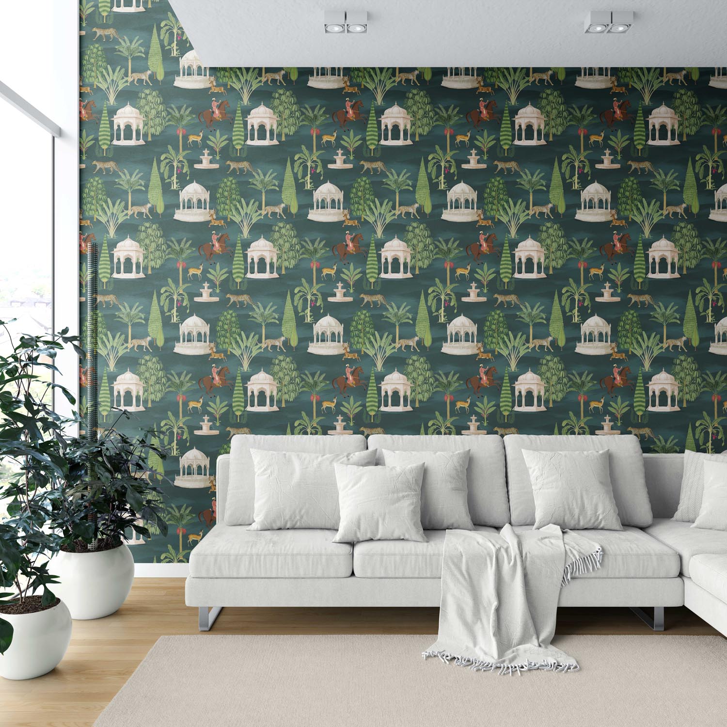 ‘Picturesque’ Vintage Heritage/ Ethnic Chinoiserie Wallpaper (Teal Green/ White/ Brown/ Red)