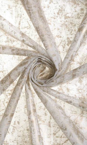 Poetically described as golden sunlight on white snow. It is a sheer drapery fabric with its vast white expanse randomly touched with metallic golden color. The abstract tissue paint finish adds to its gleaming beauty. Good for standalone draperies as well as for mixing and matching, Puro is a touch of gold for your interior.