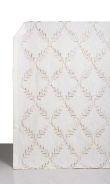 Those who love geometric patterns as passionately as floral designs can now gratify their design aspirations in this linen-blend. Slender sprigs move rhythmically from top to bottom caving in at intervals to form a harlequin pattern. Window treatments in this white fabric with creamy-beige embroidery make a gorgeous visual treat with subtle contrasts.