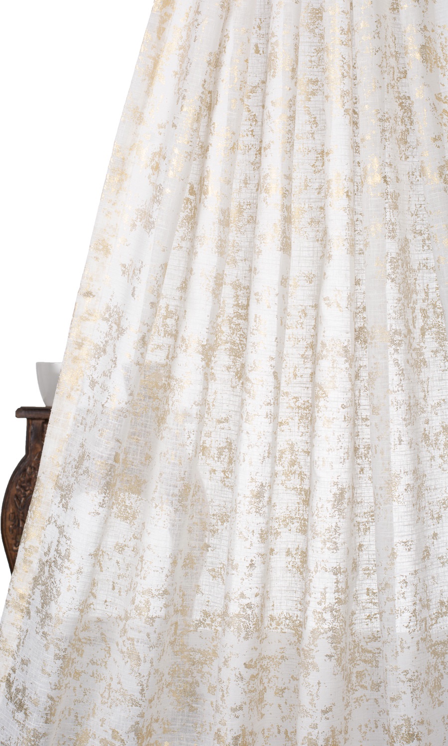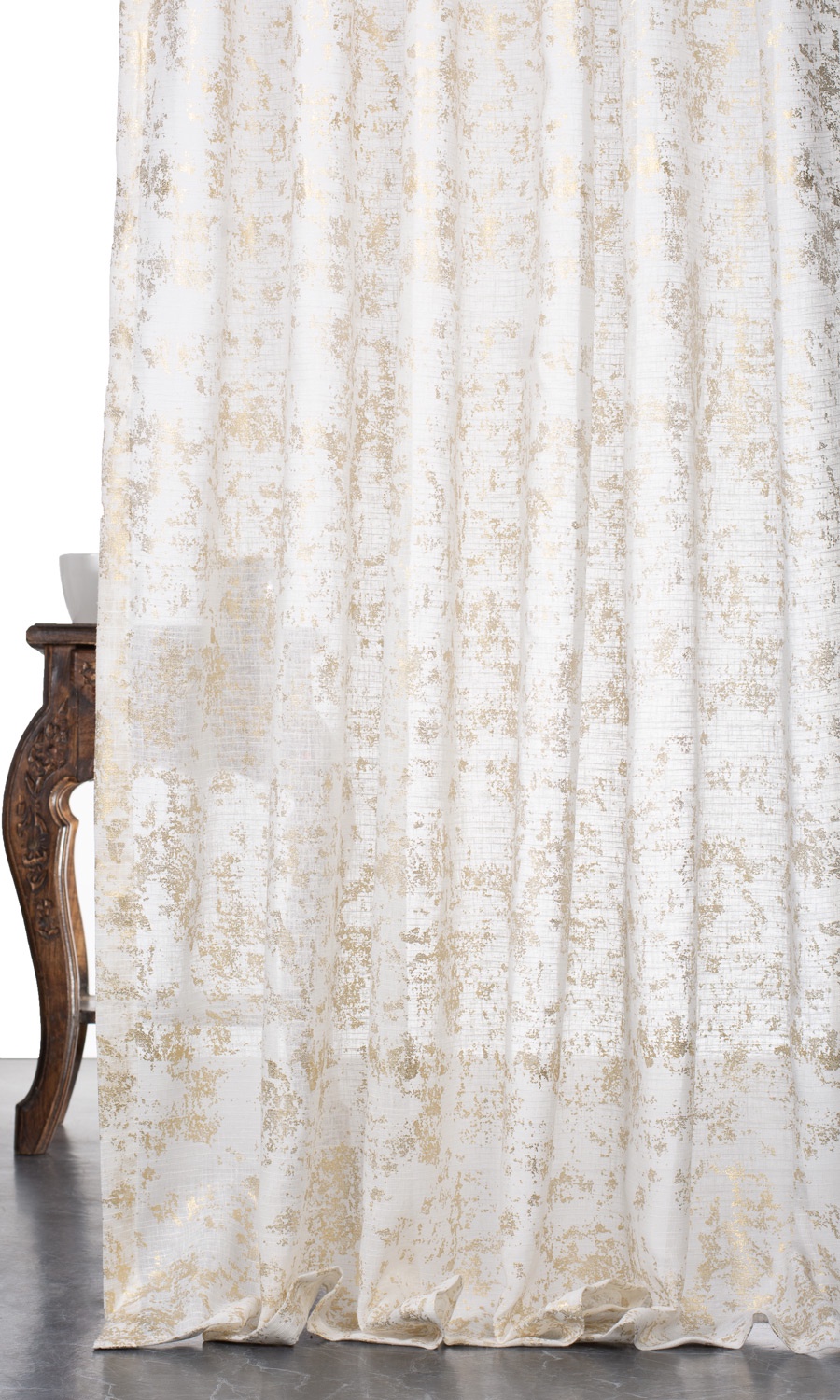 This exuberant semi-sheer fabric is just the right bit of glam you need to finish a formal living room or a Bohemian haven fraught with jewel tones. Its warm white broken only by the slubs of its weave and the golden accents of its abstract print offers a modern pattern in a tried-and-true regal palette that never goes out of style. So, you can welcome light during the day and let it glitter under your chandeliers at night offering a fiesta of golden light and stately elegance.