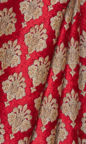 This magnificent jacquard fabric gives an unapologetically luxurious vibe. Its velvety ruby red backdrop features a vintage floral pattern in beige and brown. Alternate placement of floral motifs adds a gorgeous geometric illusion. Unbelievably majestic!