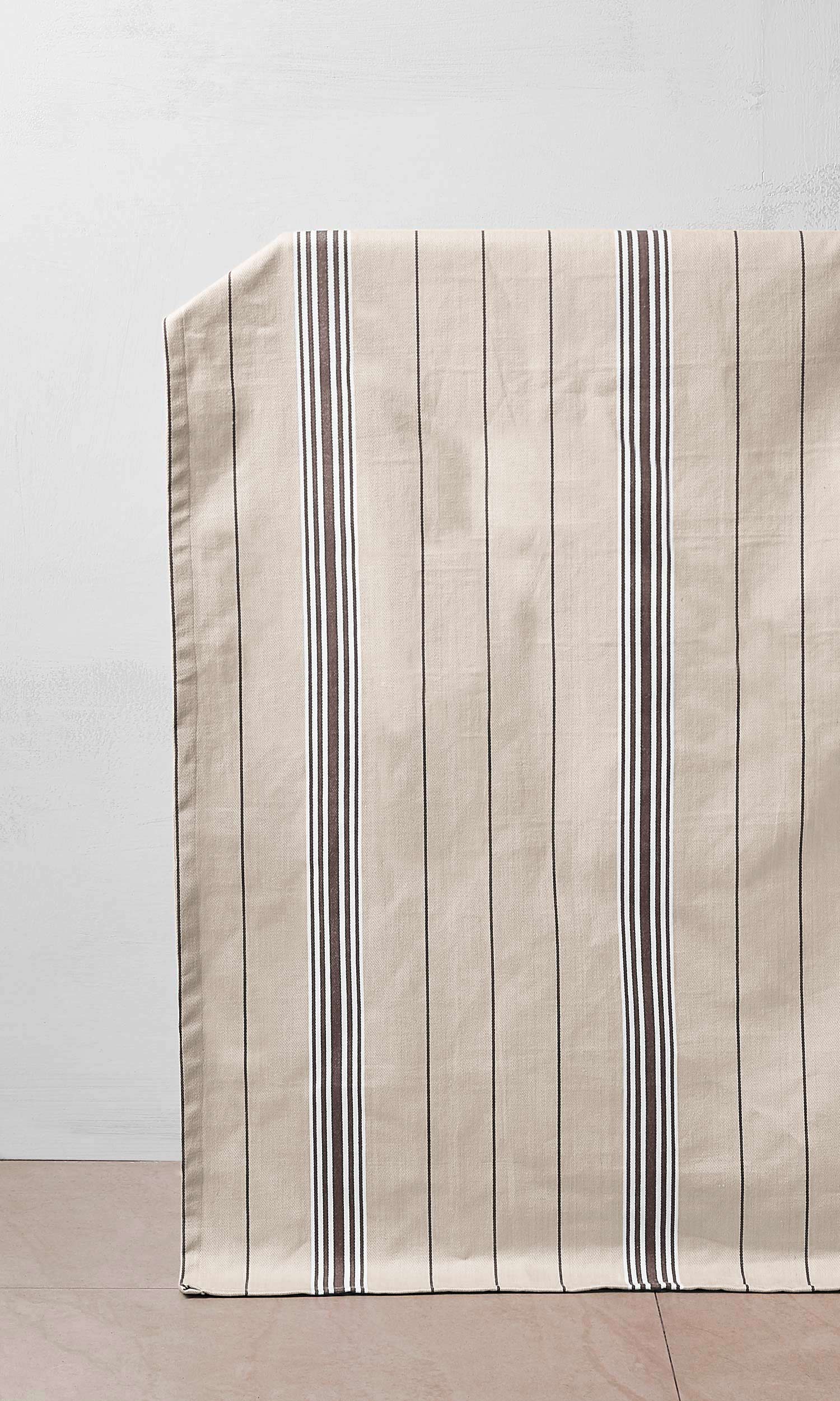 A 100% pure cotton with bold masculine stripes. Featuring a versatile blend of neutral hues beige, brown and white in a timeless pattern of vertical stripes, Roasted Sepia offers to be the manifestation of simple elegance. Make it the finishing touch of your timeworn rustic cottage or a sophisticated man cave.