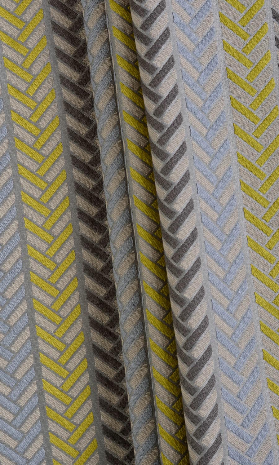 Sakin celebrates symmetry and harmony with its cool color palette and horizontal herringbone design. Its grey base is patterned with columns of herringbone zigzags in yellow, steel blue and charcoal grey. This simple yet stunning fabric can visually elongate your windows. We recommend it for draperies or roman blinds for a clutter-free space.