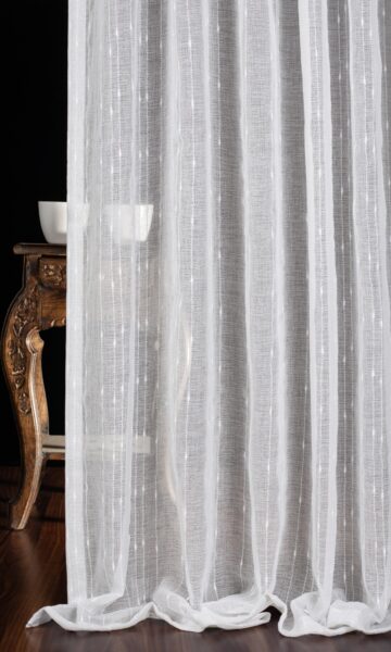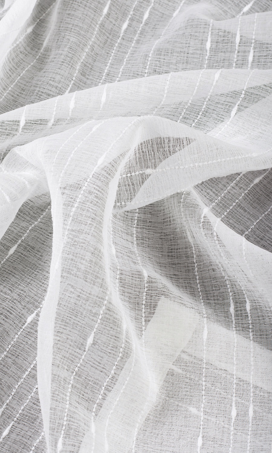 A self-patterned white sheer that makes even a simple sophistication look extraordinary with its vertical stripes. This gossamer elegance softens the space and paints the home in a dreamlike beauty of diffused light. Welcome light and ensure privacy with this feast of rich texture, subtle pattern and casual charm.