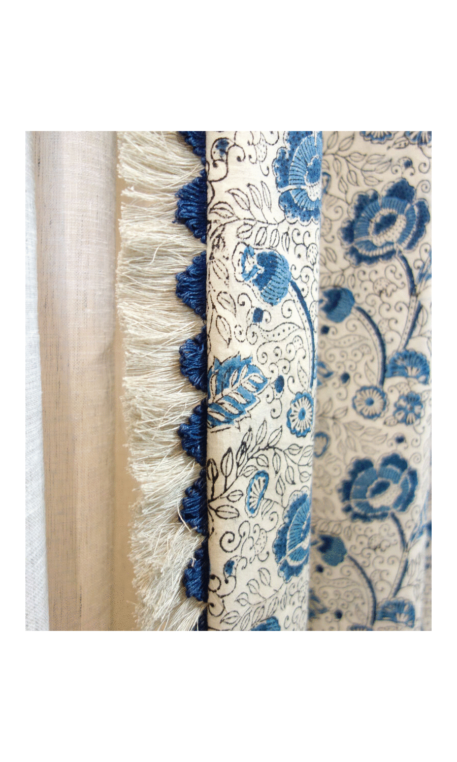 Fringe fan edge trims are handsewn on left and right edges of curtain panels for a delightful effect.
