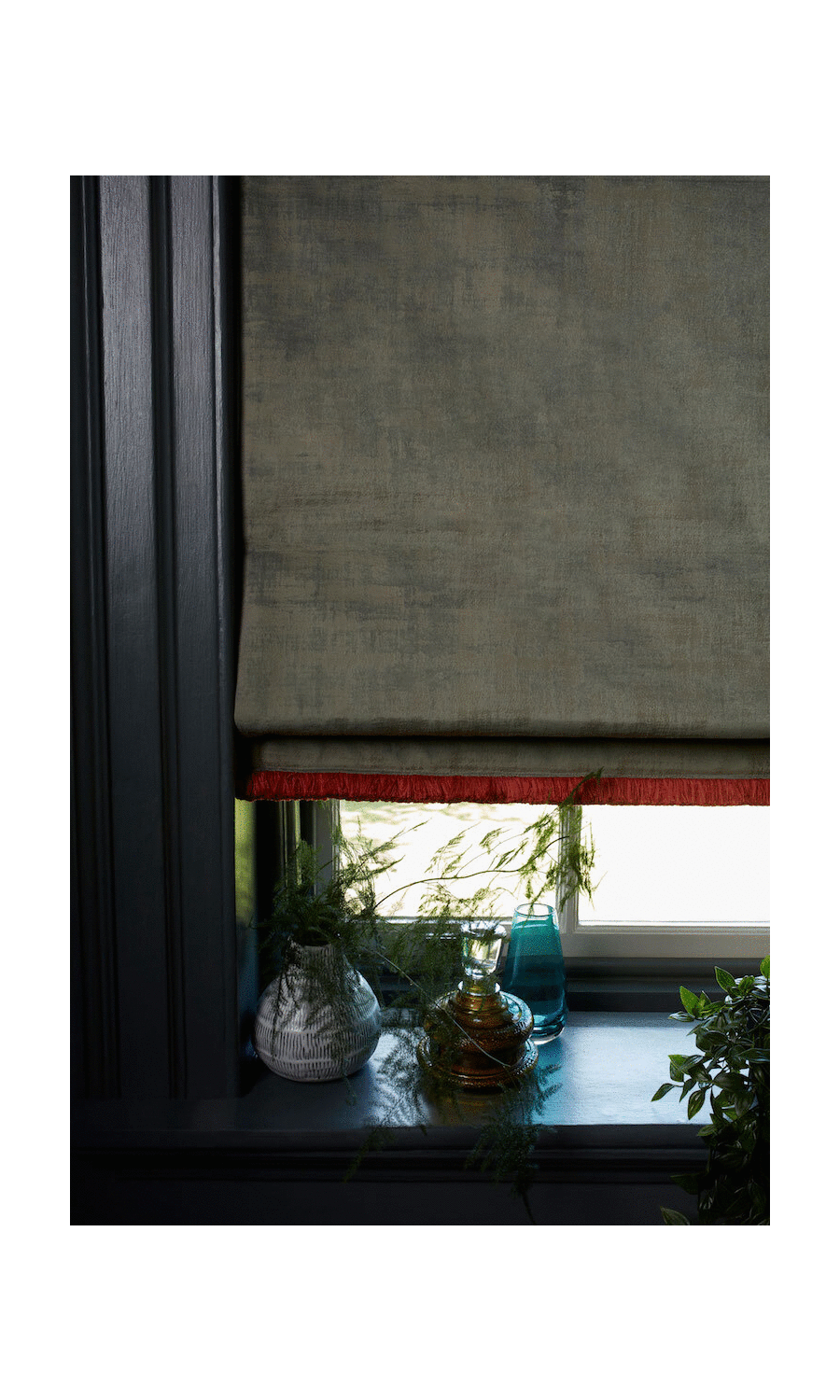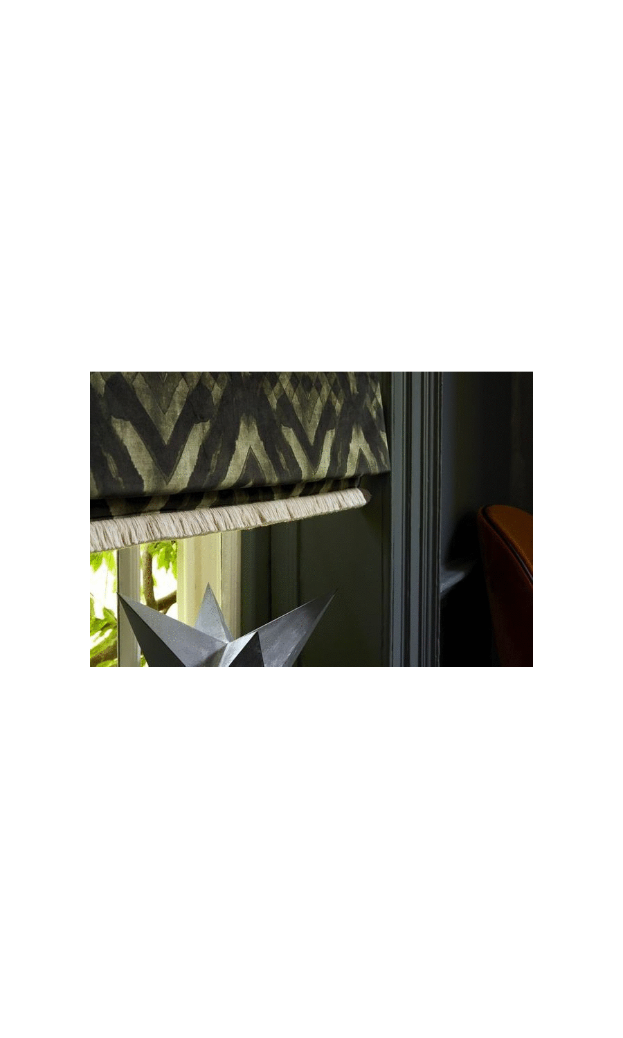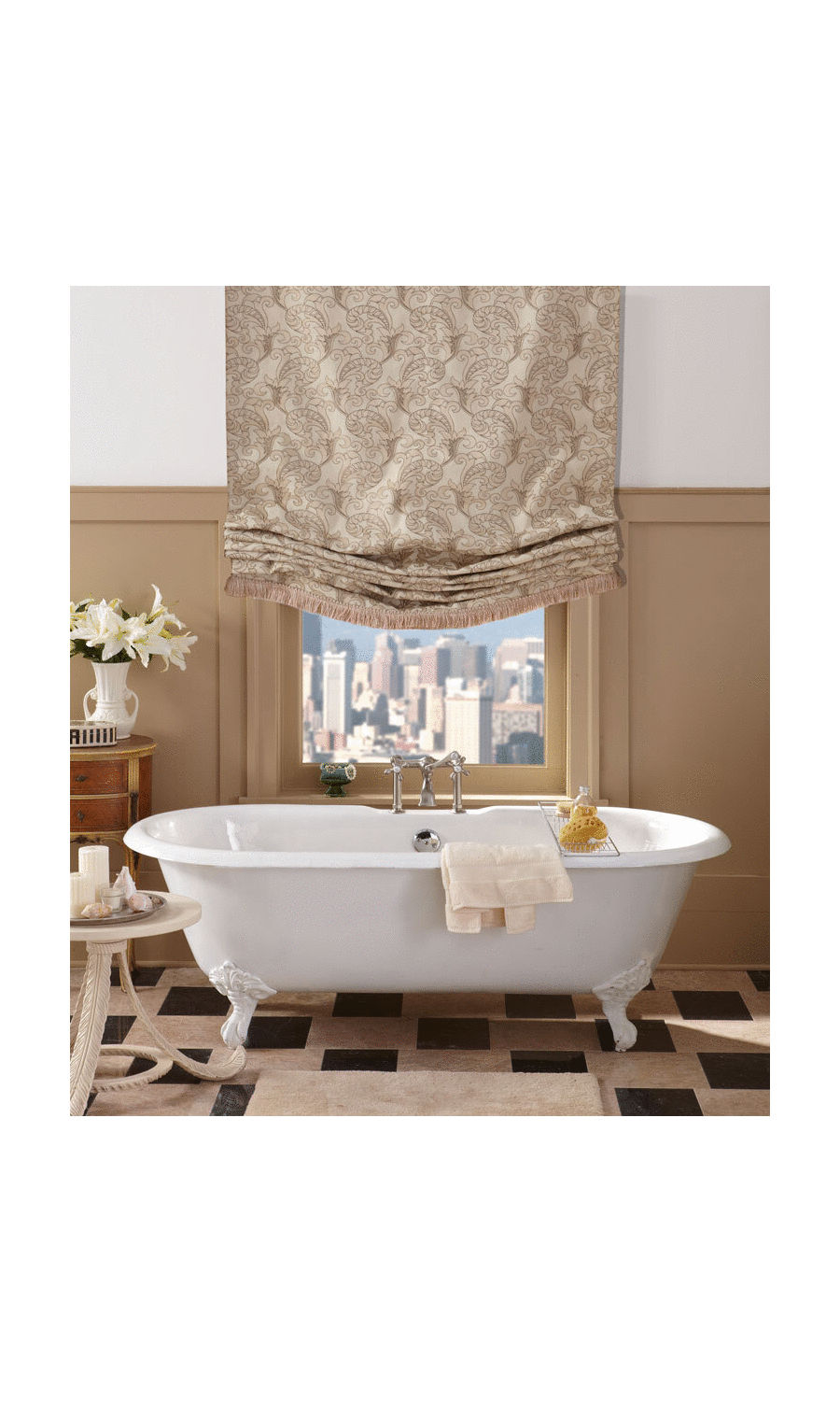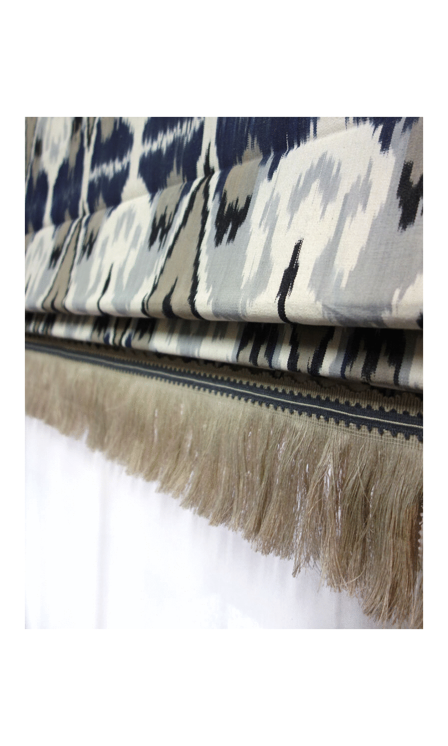 Fringe fan edge trims are handsewn on bottom hem of a roman shade for a delightful effect.